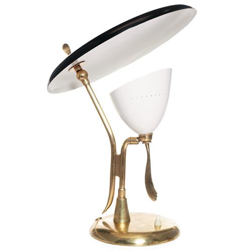 Arredoluce desk lamp, attribution, Italy, 1950s, brass base with black and white enameled metal shade and diffuser, unmarked, 13"dia. X 18"h, very good condition