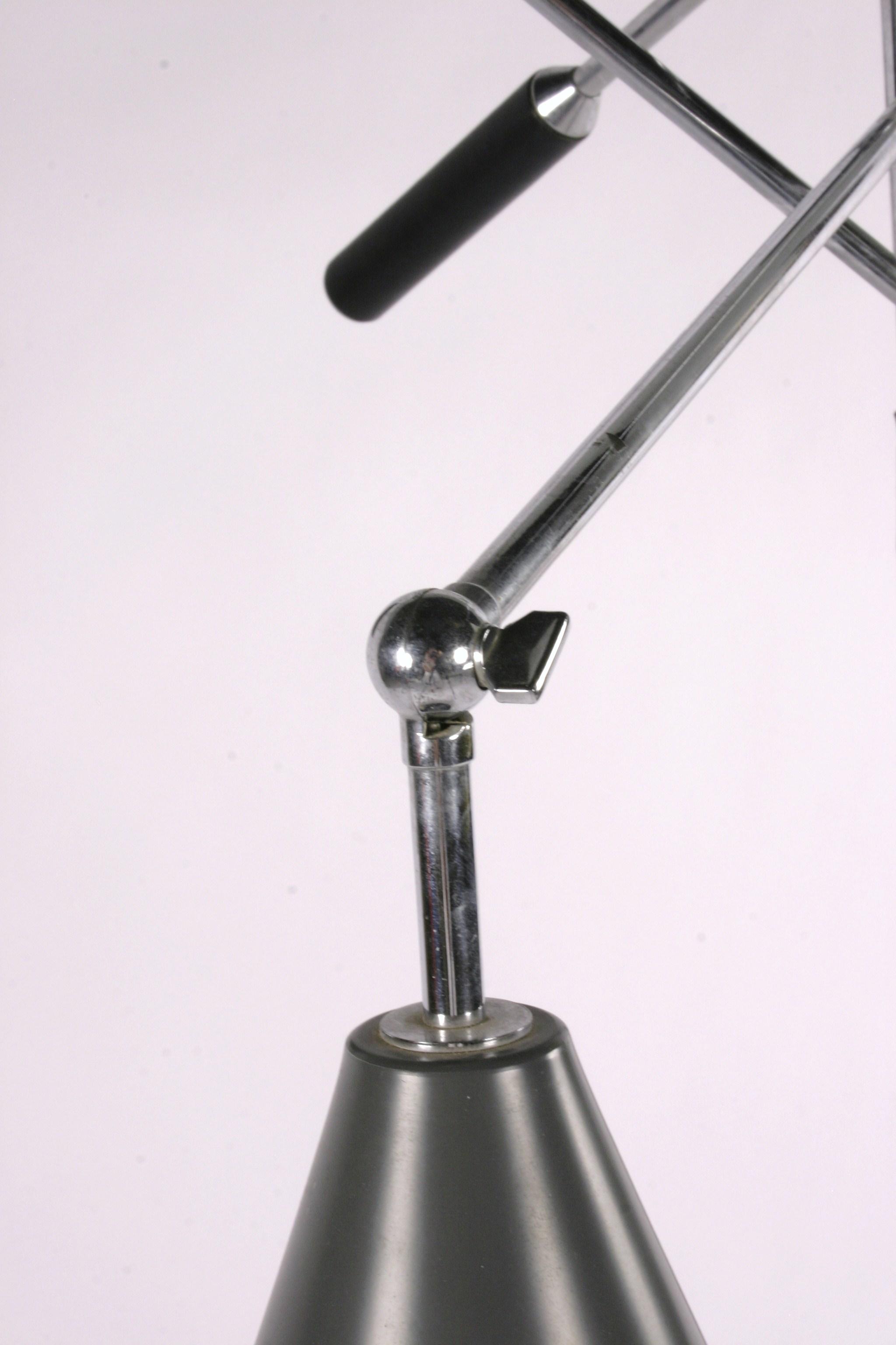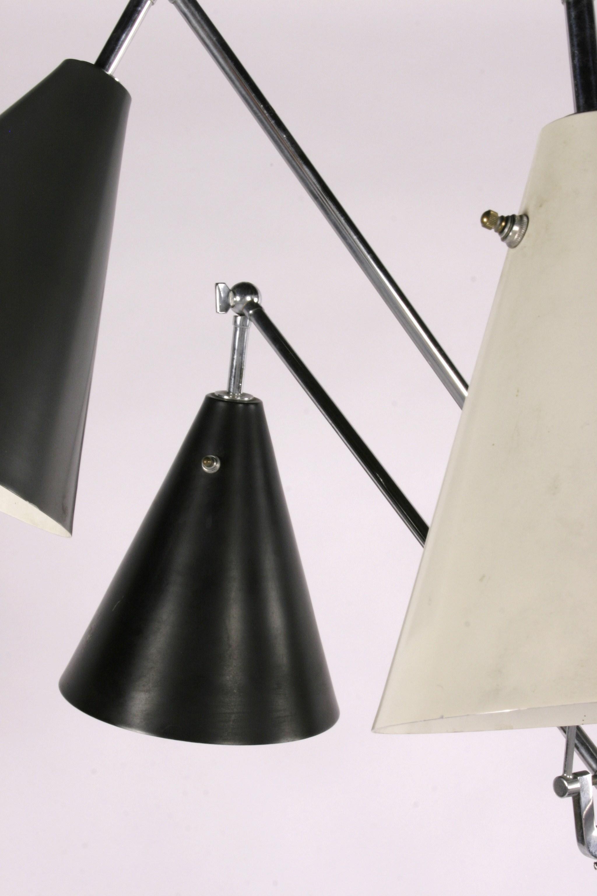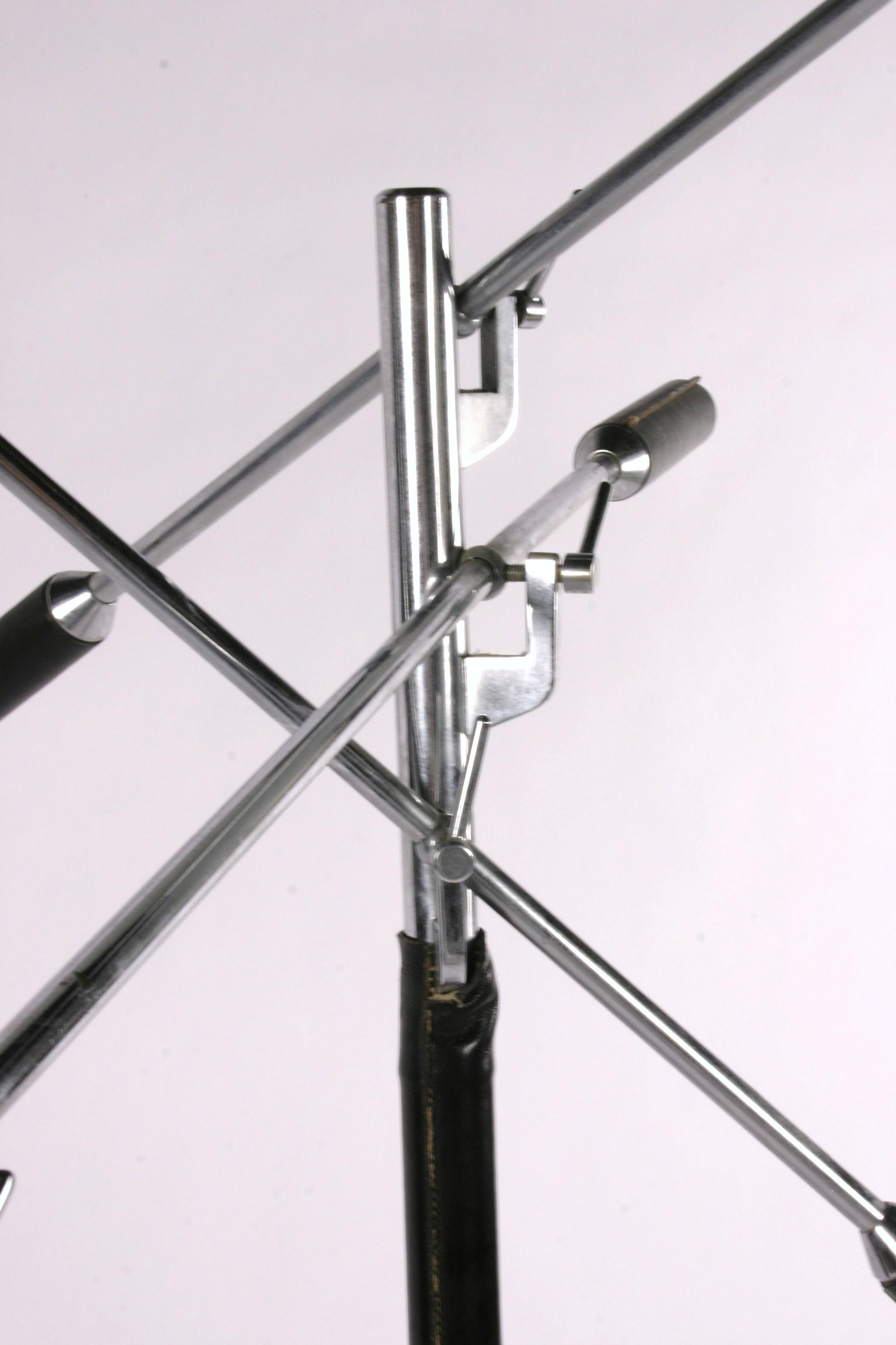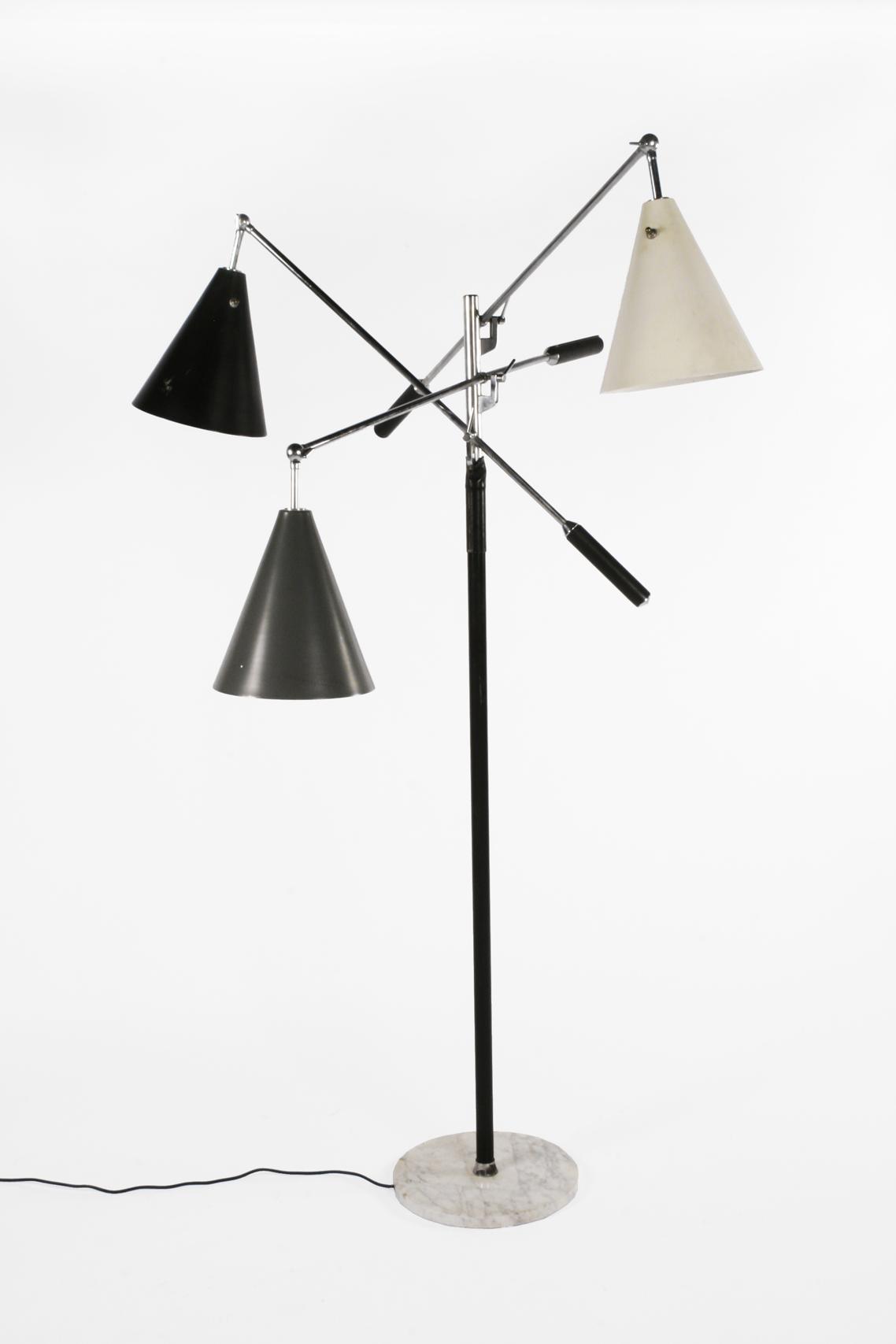 58h x 32L arms x 9.5h x 8.5dia shades, marble, chrome, leather, black/grey/white painted shade