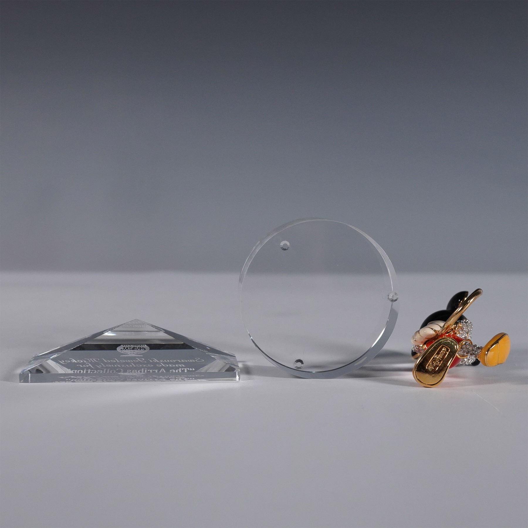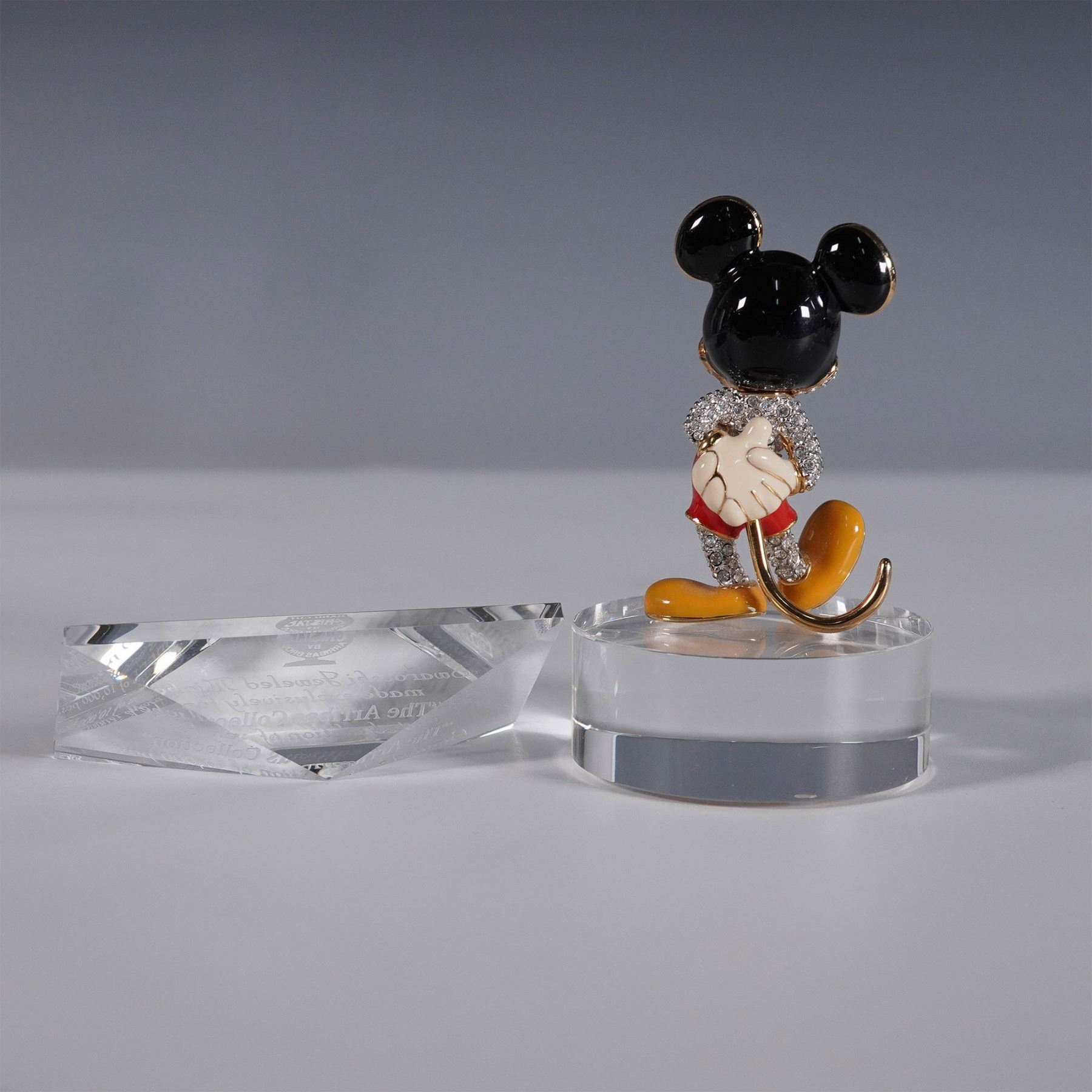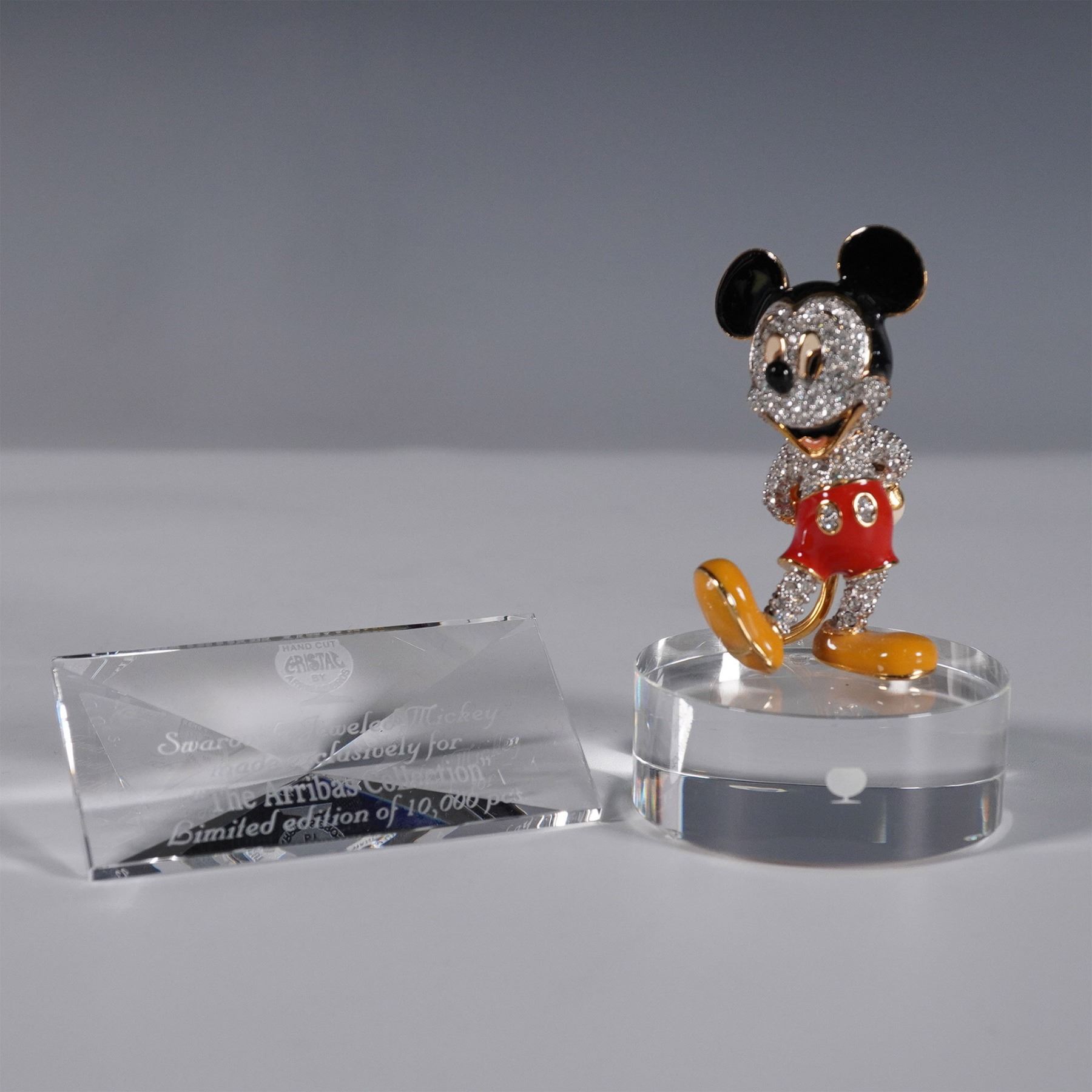 A stunning limited edition Jeweled Mickey Mouse figurine, created exclusively for The Arribas Collection with Swarovski components, featuring Mickey Mouse adorned in Swarovski crystals with signature red shorts, yellow shoes, and black ears, meticulously crafted with gold-tone metal accents. This lot includes the Swarovski Jeweled Mickey Mouse figurine mounted on a clear acrylic base, an engraved display plaque. Produced as part of a limited edition release of 10,000 pieces, this highly sought-after collectible appeals to Disney collectors and Swarovski enthusiasts. This item has its original box. Certificate of Authenticity included. This item has a base included. Tallest item measures 2.25"H.