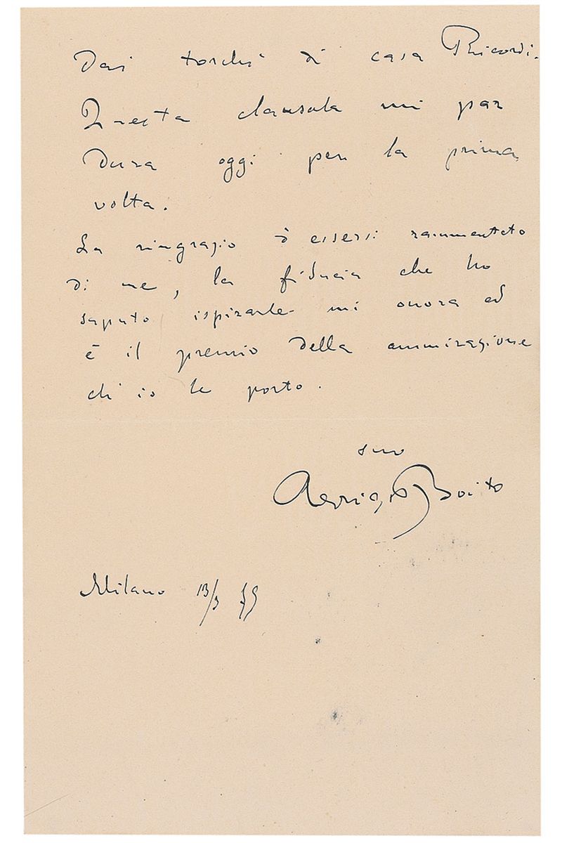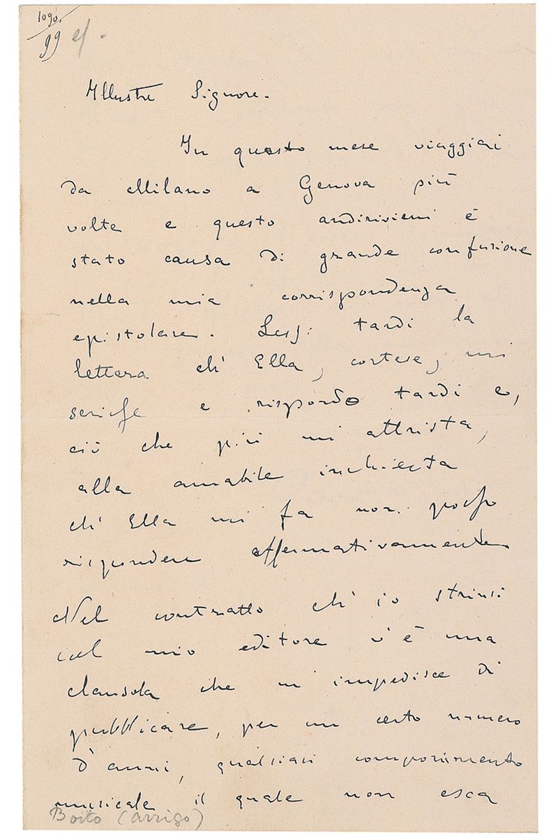 Italian composer and librettist (1842–1918) best known for the opera Mefistofele. ALS in Italian, two pages on two adjoining sheets, 4.5 x 7.25, March 13, 1879. Untranslated letter to a gentleman. In fine condition, with some stray ink flecks to second page and a small pencil notation to top of first page.