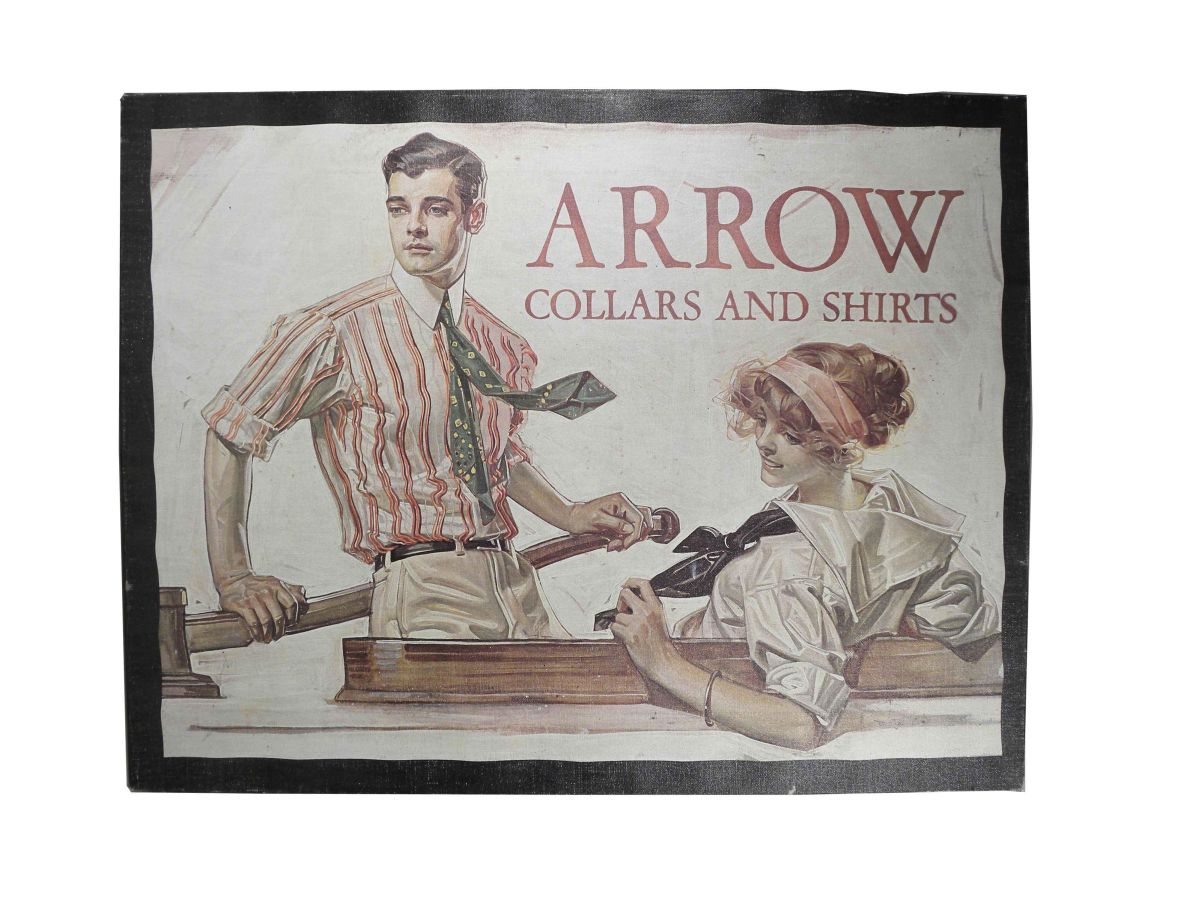 Arrow Advertising Collars and Shirts Canvas Sign. Depicting a couple on a boat. Very good condition. 28 X 22 inches.