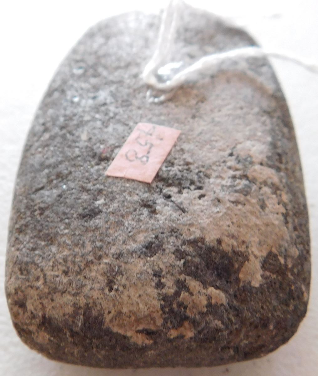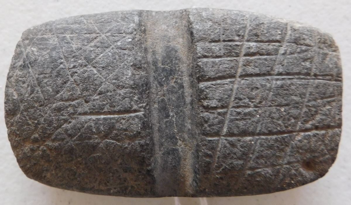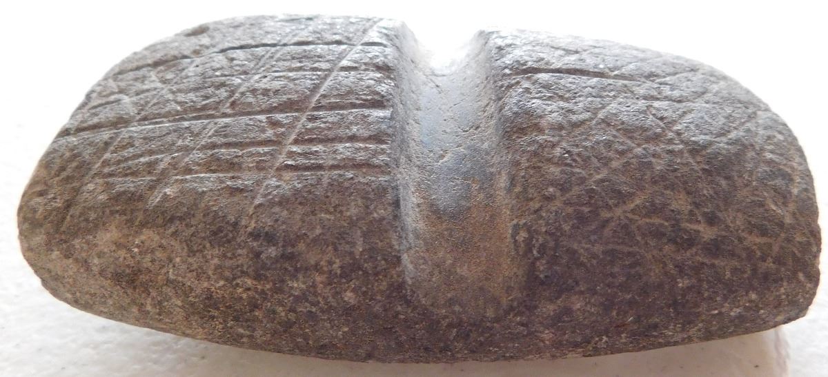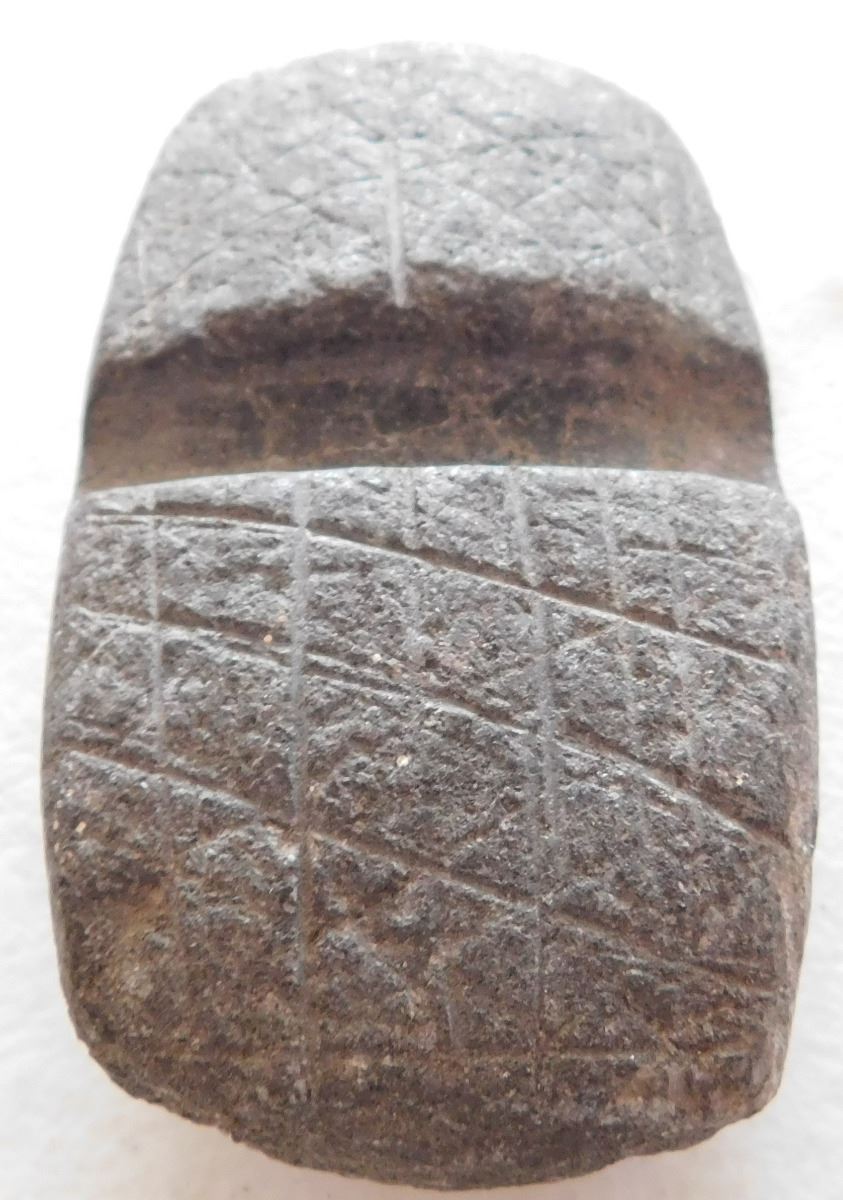 Arrow Shaft Straightener, pre-historic item. Made of fine steatite, this engraved arrowshaft straightener measures 3 1/2 x 2 x 3/4 inches. This arrowshaft straightener was found near Flinn Springs, San Diego, California. The engraving has a spider web design. Condition: This item is in a nice condition with good patina, see images. Shipping: $20.00 w/insurance.