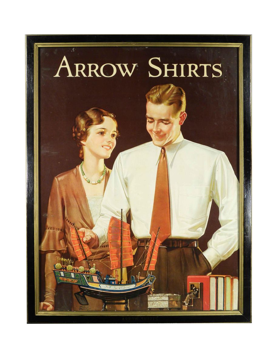 Arrow Shirt Cardboard Sign in original frame. Frederick Stanley, artist. Some scuffs and wrinkles otherwise good condition. 25 X 32 inches overall.
