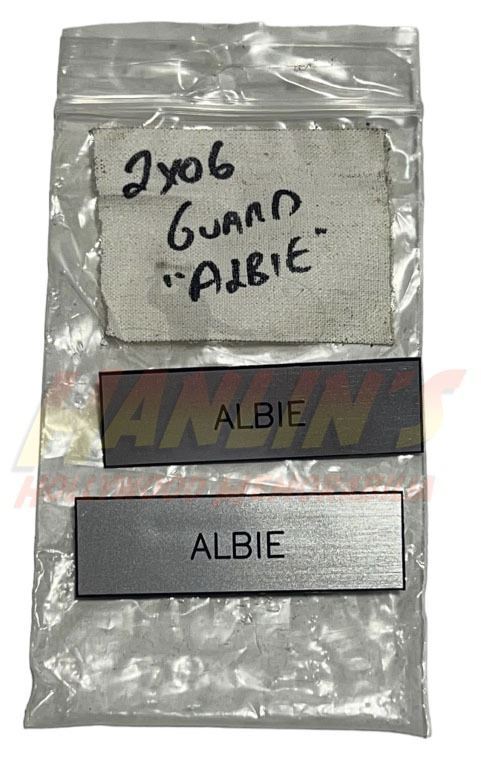 Original set of 2 guard name badges for "Albie" used in the production of the superhero television series 'Arrow' (2012-2020), follows billionaire playboy Oliver Queen (Stephen Amell), who claimed to have spent five years shipwrecked on Lian Yu, a mysterious island in the North China Sea, before returning home to Starling City (later renamed "Star City") to fight crime and corruption as a secret vigilante whose weapon of choice is a bow and arrow.