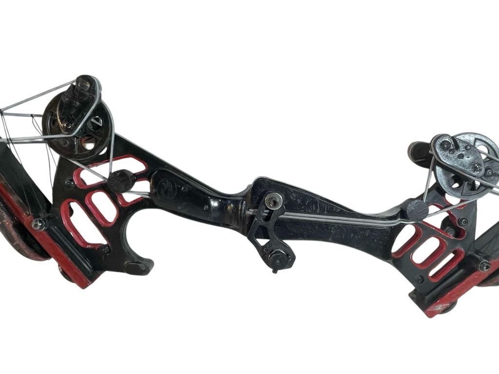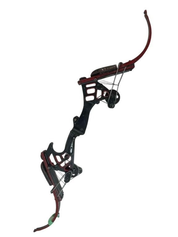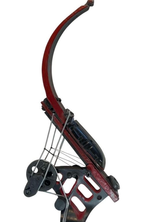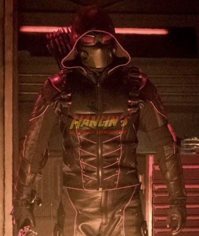 This bow is a derivative of a real kestrel bow. The base bow is the typical seen bow used by "The Green Arrow" seasons 3 through 6. Where there were silver accents for the Green Arrow there are red accents here for the Dark Arrow. As Stephen Amell did most of his stunts this bow was used more than the hero one.