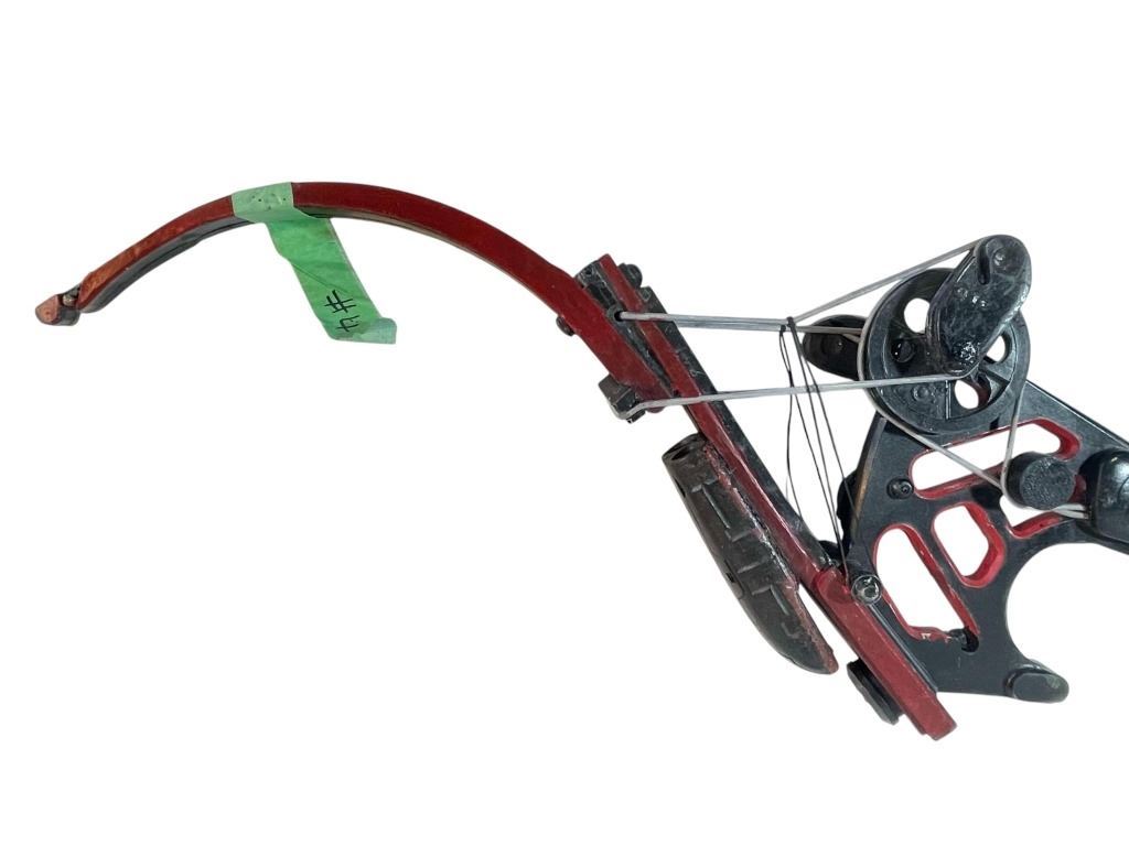 Made of rubber with metal running through in order for it to hold the original real string with tension. Arrow rest is a separate metal piece. Number 4 written on the green production tab.