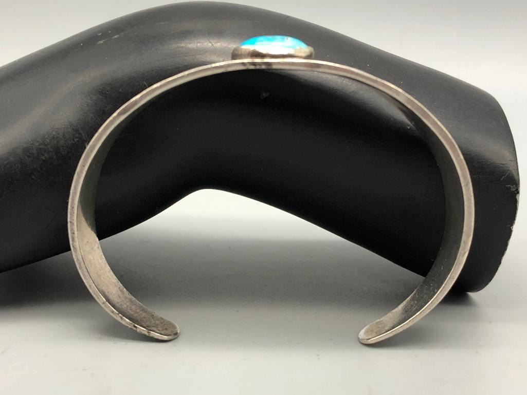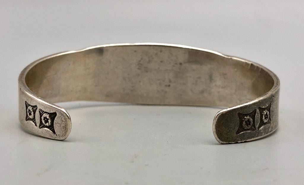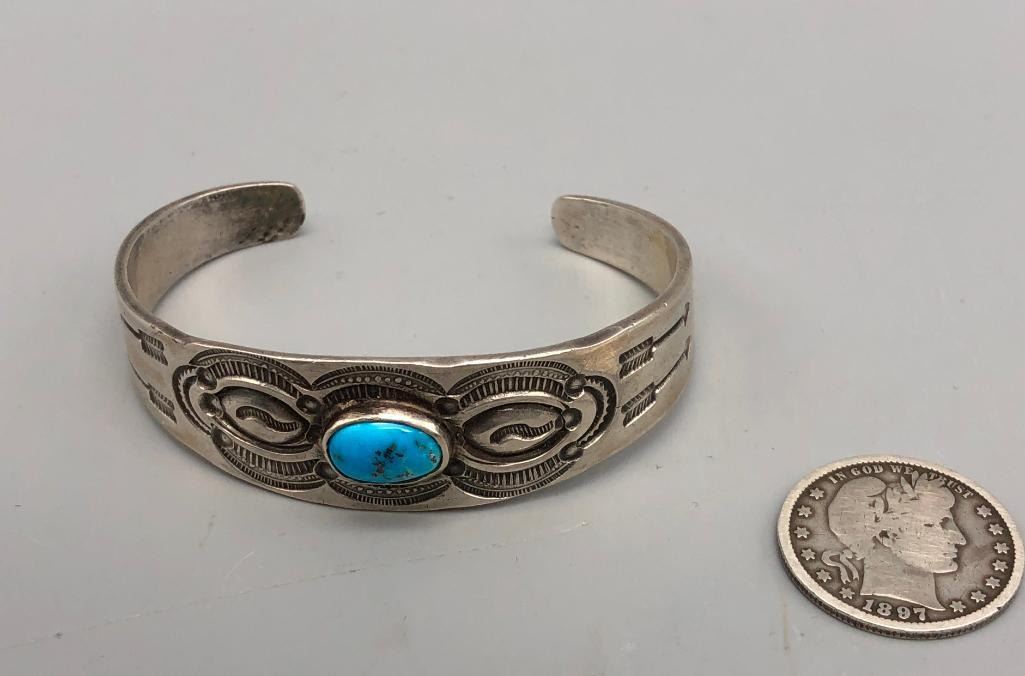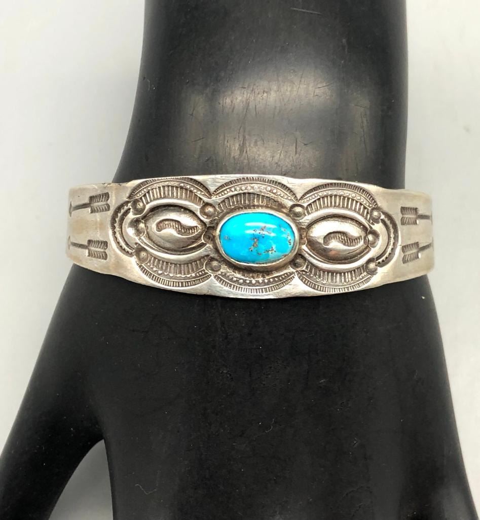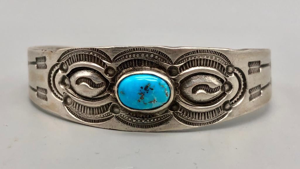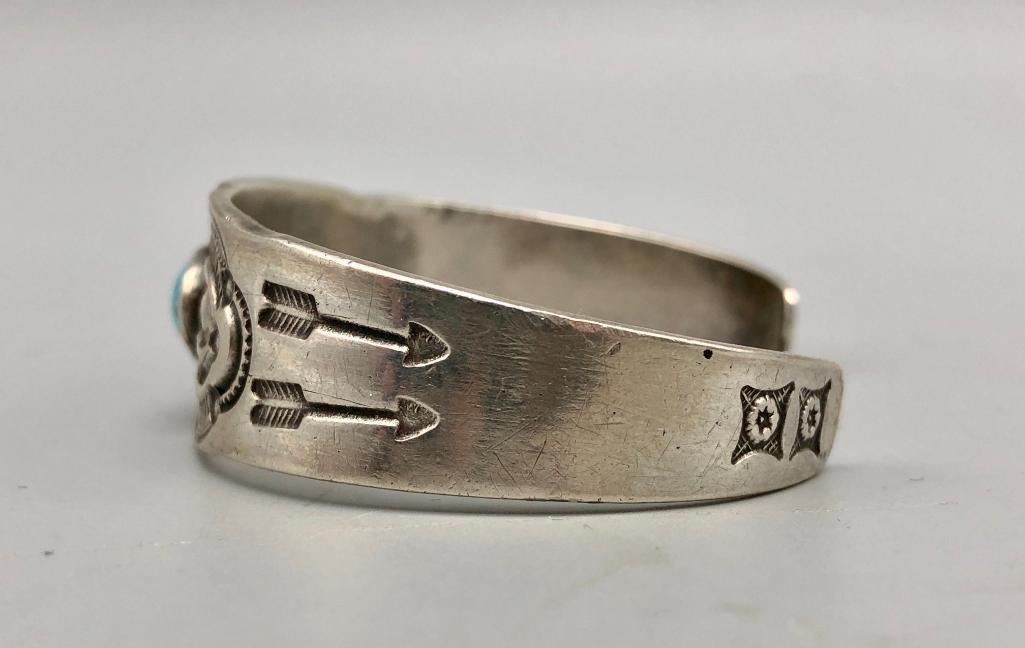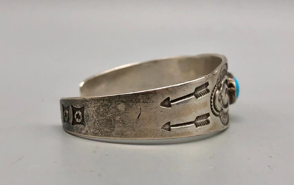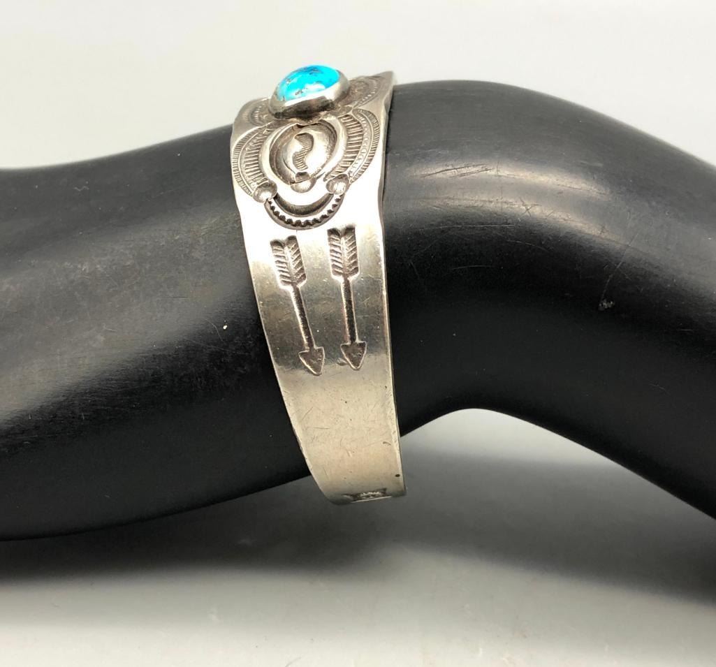 Up for consideration is an arrow themed vintage handmade bracelet. This is a beautiful wider style bracelet that has gorgeous hand stamped designs accenting a turquoise stone in the center. It has a nice sturdy cuff, with a good weight to it. It is sterling silver. MAKER: Unmarked. APPROX AGE: Circa 1960s. SIZE: Inside circumference measures 5-3/8 inches long. Opening is an additional 1-1/8 inches, fitting a 6-1/2 inch wrist. Width is 3/4 inches. weighs 28.8 grams. CONDITION: Good for its age, normal wear expected. Please look closely at the pictures as they are an important part of our description and are hereby incorporated into the description, specifically with regards to condition. SHIPPING: There will be a $5 handling / packaging fee for shipping this lot. The actual cost of postage will be added on top of that. BUY IT NOW: If you would like to buy this item now, without waiting for the auction day to bid on it, we do offer this option (which is available up to 48 hours before the actual auction starts). The “Buy it Now†price is the high estimate of this lot (plus applicable fees and the Buyer's premium is discounted to 10% when using the Buy it Now option). If you would like to exercise this option, you must contact us by email (or phone as long as you talk to someone live). Reference this lot number and your intention to "Buy it Now."