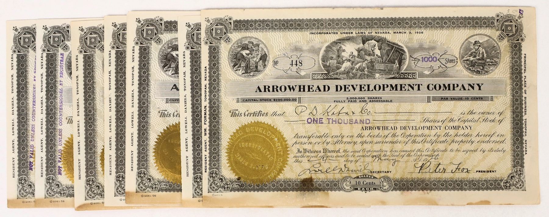8 Arrowhead Development Company Stocks c.1926-29. This company owned or operated several properties, with the Douglas County property known as the Victory. It was located 15 miles south of Wellington in the Sweetwater Range & was said to have intersected mercury vein. Arrowhead Development also owned property in Weepah, the Supply mine in the Virginia District & San Bernardino County. These are from the Weepah property. See photos.