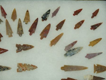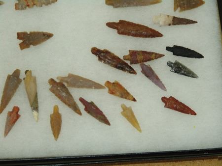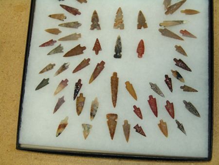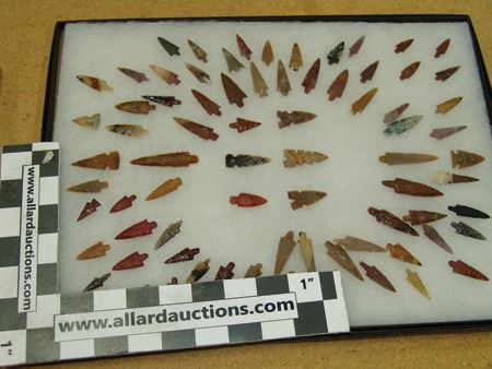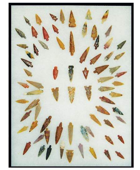 Various Ages, Impressive display of 77 expertly knapped large and small points made from many different types and colors of stone. Very good condition. In 16" x 12" frame. 1" - 2-1/2"