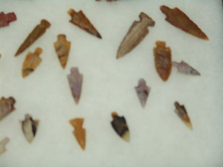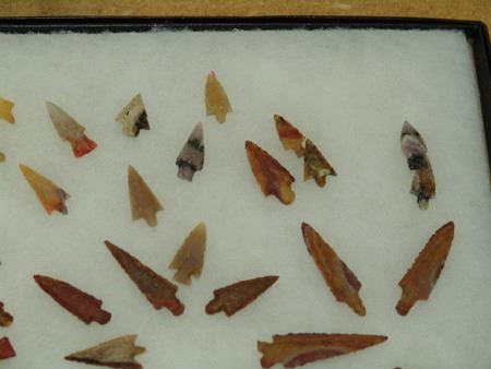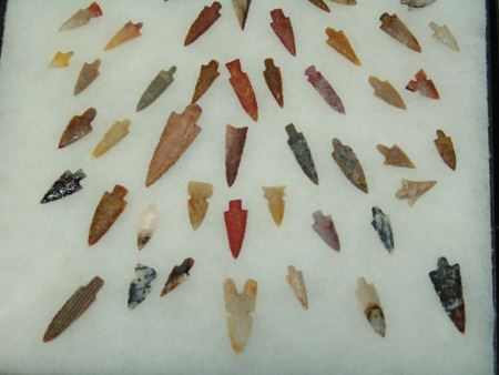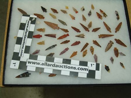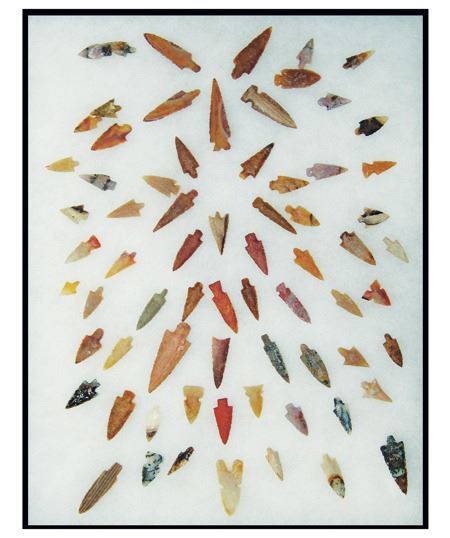 Various Ages, Impressive display of 71 expertly knapped large and small points made from many different types and colors of stone. Very good condition. In 16" x 12" frame. 1/2" - 2-1/4"