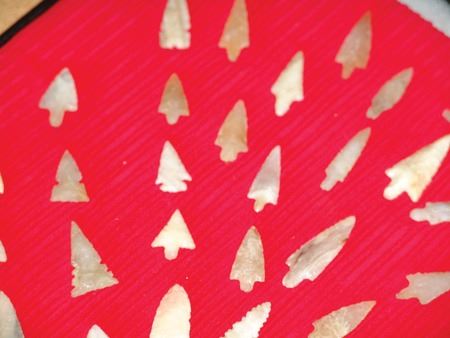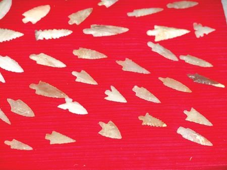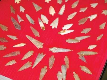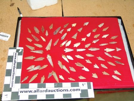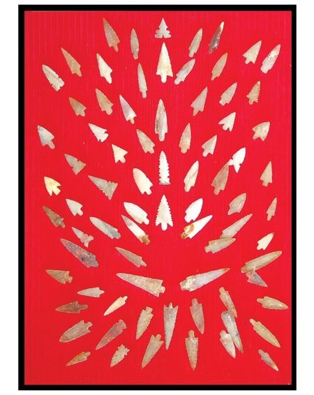 Mid/Late 1900s, Impressive display of 82 expertly knapped large and small points made from many different types and colors of stone. Very good condition. In 16" x 12" display. 3/4" - 2-1/4"