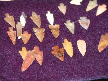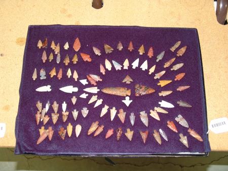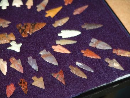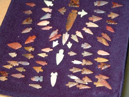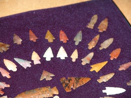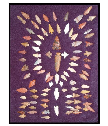 Mid/Late 1900s, Impressive display of 94 expertly knapped large and small points made from many different types and colors of stone. Very good condition. In 16" x 12" display. 5/8" - 2"