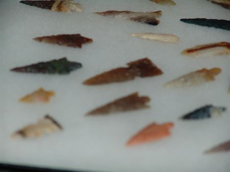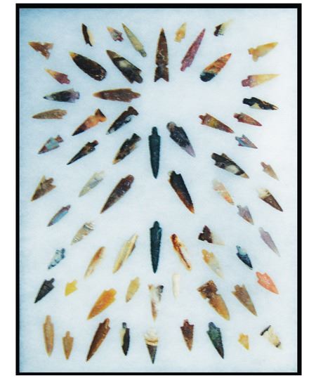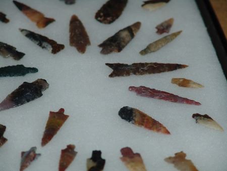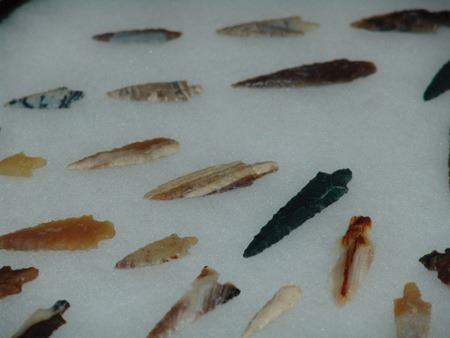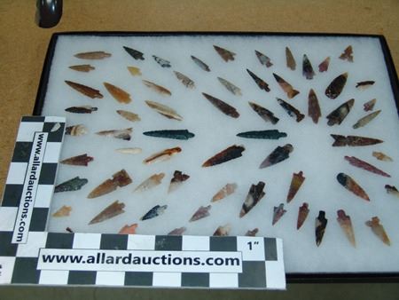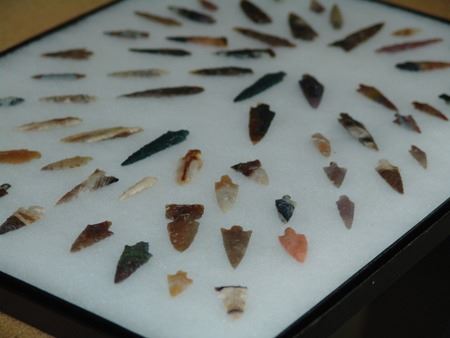 Mid/Late 1900s, Impressive display of 67 expertly knapped large and small points made from many different types and colors of stone. Very good condition. In 16" x 12" display. 5/8" - 2-1/8"