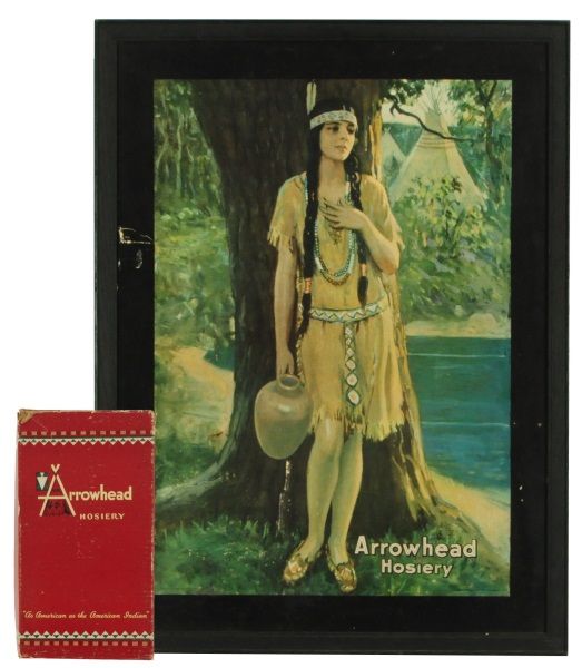 ign measures 22 1/2" x 30". With four pair of Arrowhead Hosiery Hose. Size 9 1/2. In Arrowhead Hosiery box.