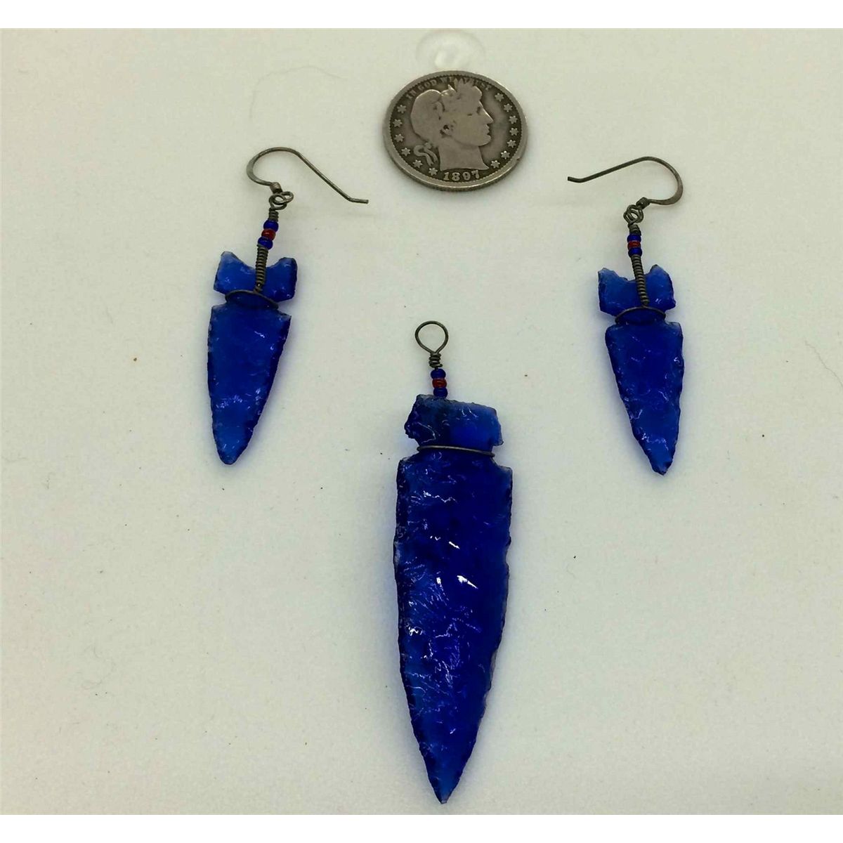 A pair of hand etched arrowhead earrings and matching pendant. Beautifully Made from blue glass.