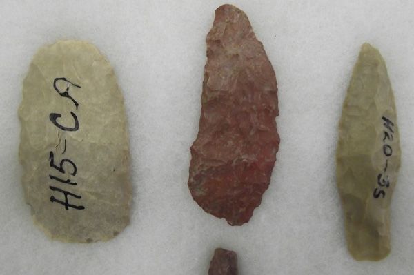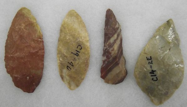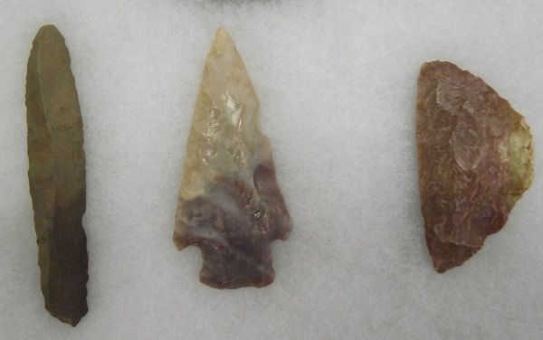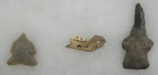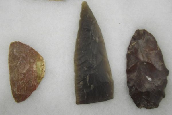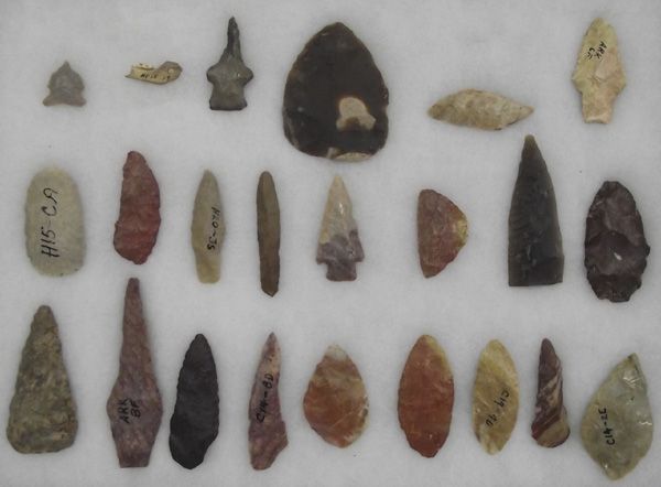 Arrowhead and Tool Collection in Riker Box. Largest 2..25'' x 3''. One small animal jaw bone with teeth. A wonderful starter gift or to add to a collection.