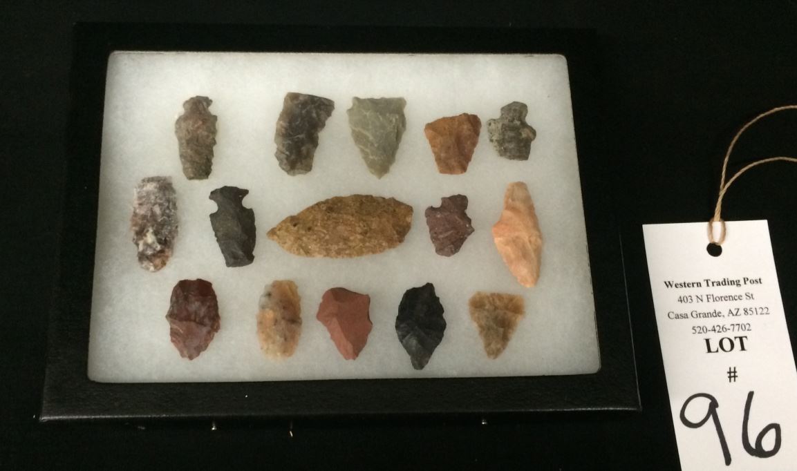 This arrowheads display (15 pieces) came right out of the old Frontier Relics Museum (Orville Mickens estate). Mr. Mickens found most of the items in his museum while tromping around historical areas from the Old West in Arizona and New Mexico. Box measures 8.25” x 6.25” x 1” deep. Shipping: There will be a $7 handling / packaging fee for shipping this lot. The actual cost of postage will be added on top of that.