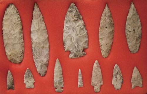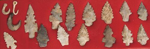 Two Frames of Arrowheads, Spear Points, Stone Fish Hooks and Stone Knives. 29 pieces in all. 12" x 18" and 7" x 12". All fine condition. (est $600-800)