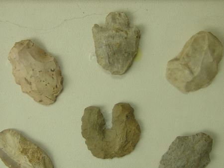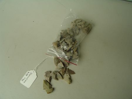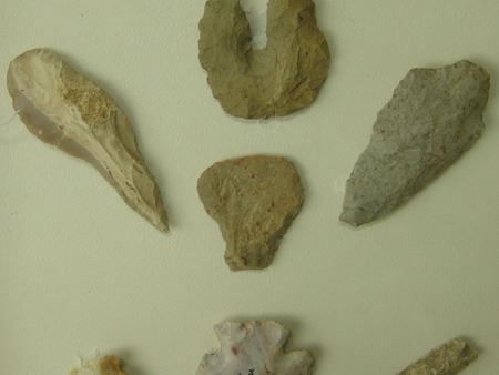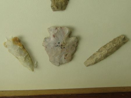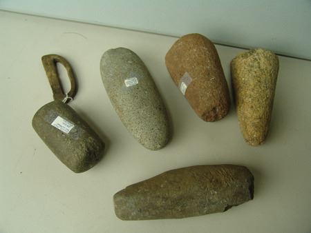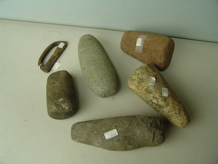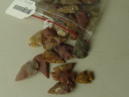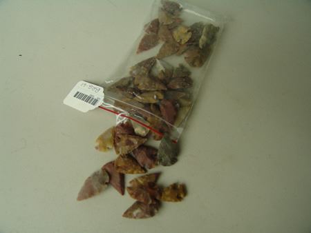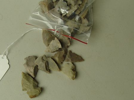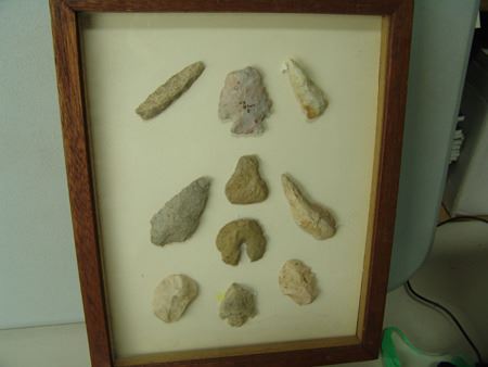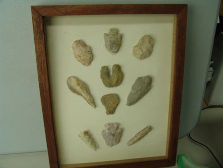 Various Ages, Here's your chance to buy, literally, a box of rocks: 10 points in shadowbox frame; 2 Columbia River stone tools; Ulu with bone handle, tag reads "c.1860"; a short pestle, tag reads "found 1920 SW Wash"; 2 pestles, one marked "Col. River Kettle Falls" and the other "Kettle Falls Near Vantage"; 2 bags of approx. 50-70 arrowheads, Various sizes