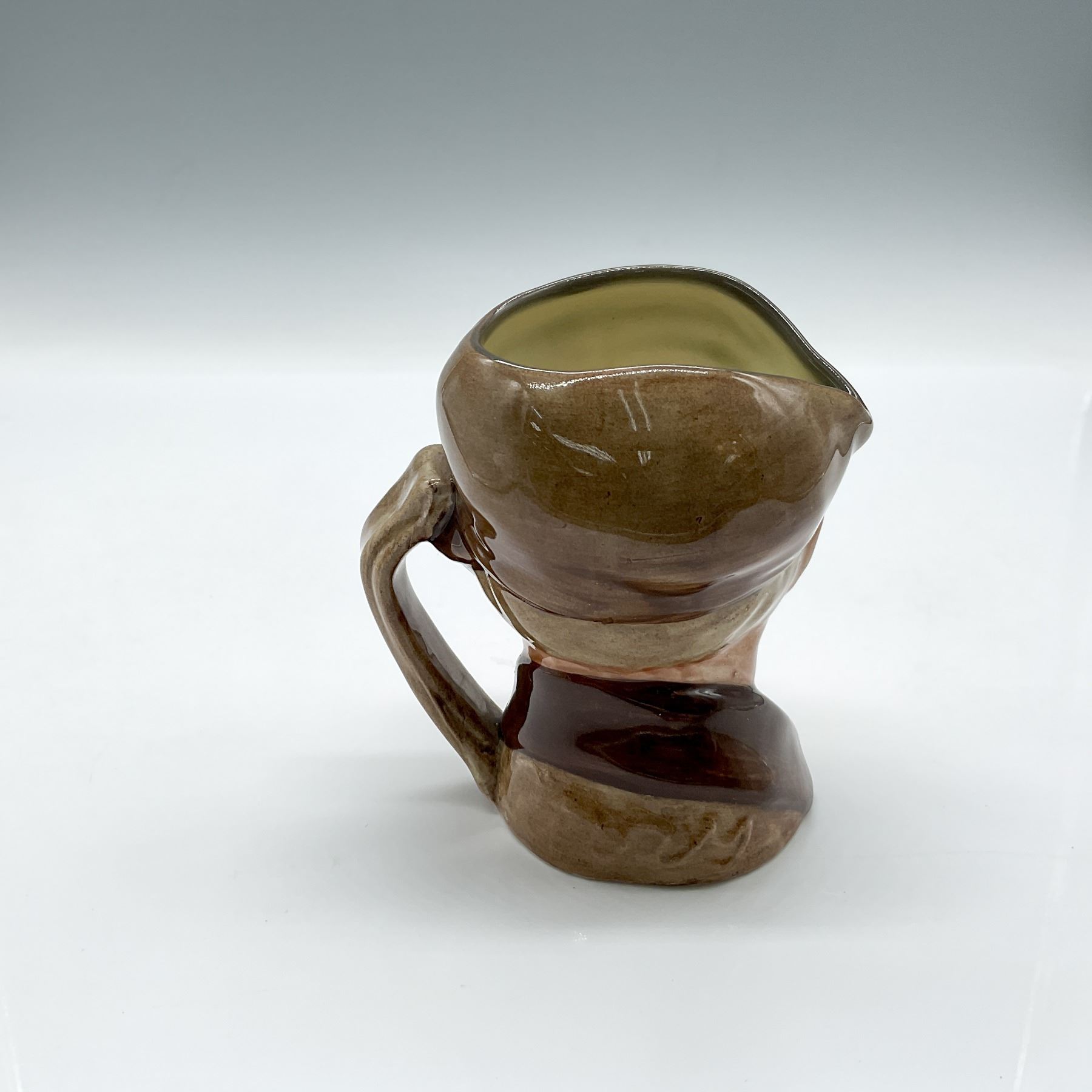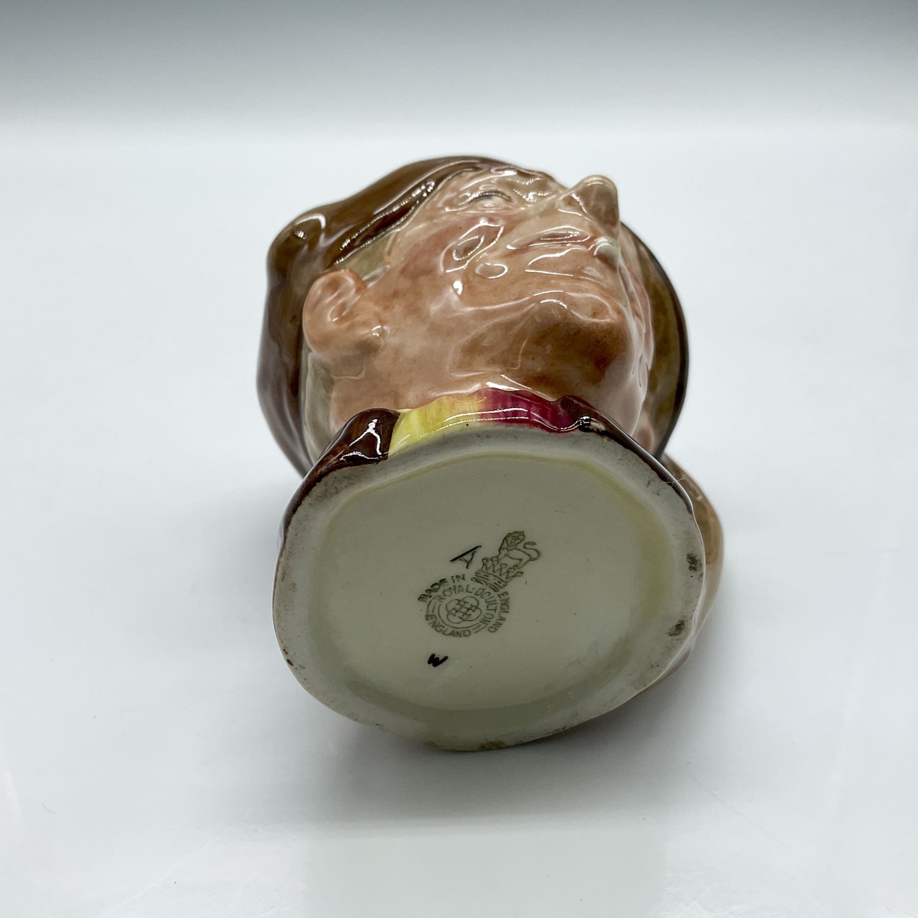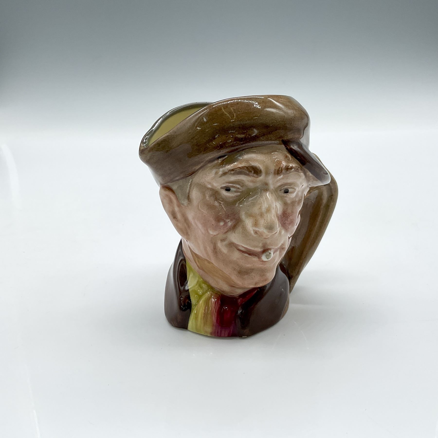 Part of the Street Vendor series, this jug is colored in brown cap and wearing a red-yellow scarf. Royal Doulton backstamp.