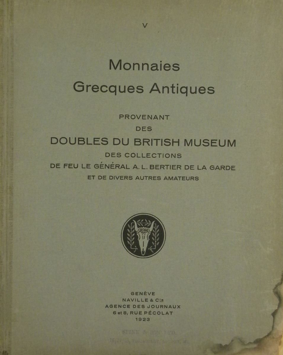 [Ars Classica V]. Naville et Cie. V. MONNAIES GRECQUES ANTIQUES PROVENANT DES DOUBLES DU BRITISH MUSEUM, DES COLLECTIONS DE FEU LE GÉNÉRAL A.L. BERTIER DE LA GARDE ET DE DIVERS AUTRES AMATEURS. Lucerne, 18 juin 1923 et jours suivant. 4to, original printed card covers. (6), 132 pages; 3038 lots; 85 fine plates depicting every single-coin lot. Front cover and first few leaves with marginal stain. Spine neatly reinforced with heavy clear tape. Photocopy prices realized laid in. Very good. A scarcer sale. Clain-Stefanelli 1949. Grierson 280. Spring 475 [also listed under "Most important sales of Celtic coins" and "Most important sales of ancient Greek coins"].