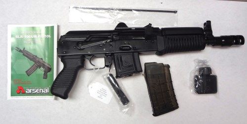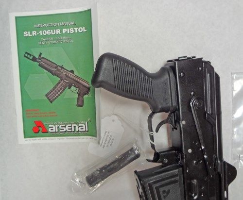 Arsenal Inc SLR106UR with Muzzle Brake Semi-Auto Pistol 5.56. Finish-Black Matte, Action-Bolt, Stock-Black Polymer Pistol Grip, Capacity-20+1 & 5+1, Muzzle-Threaded Muzzle Brake/Compensator, # of Mags-2 (1-5 Round & 1-20 Round), Safety-Manual, Sights-FT:Post RR: Adjustable, Barrel Length-8.5" Threaded, Overall Length-20", Weight-88oz, Features-Chrome Lined Hammer Forged Barrel, Black Ploymer Furniture, Side Scopr Rail, Receiver-Black, Stamped. EST. $1000-1100. ***COMES WITH LIFETIME GUARANTEE***