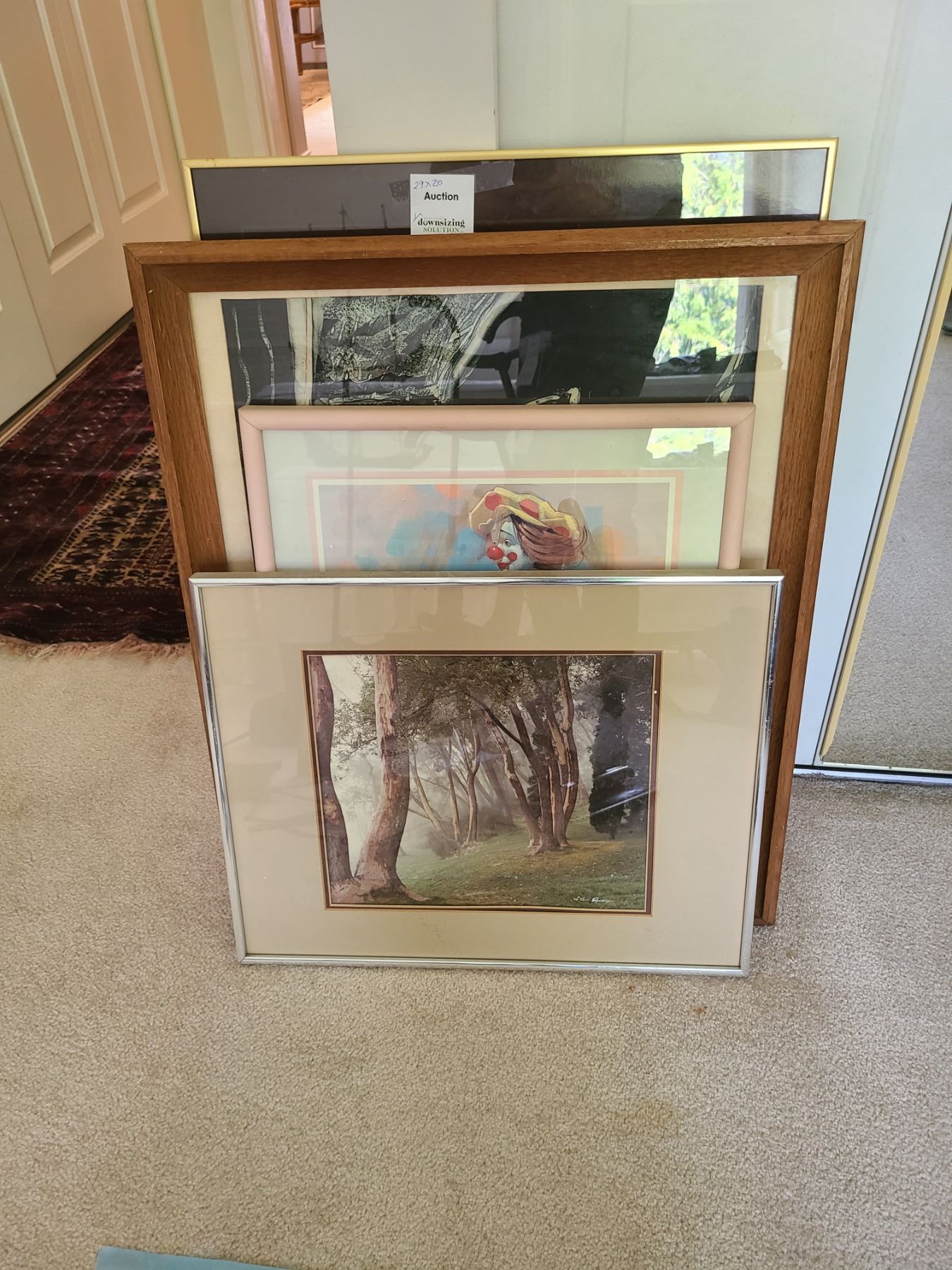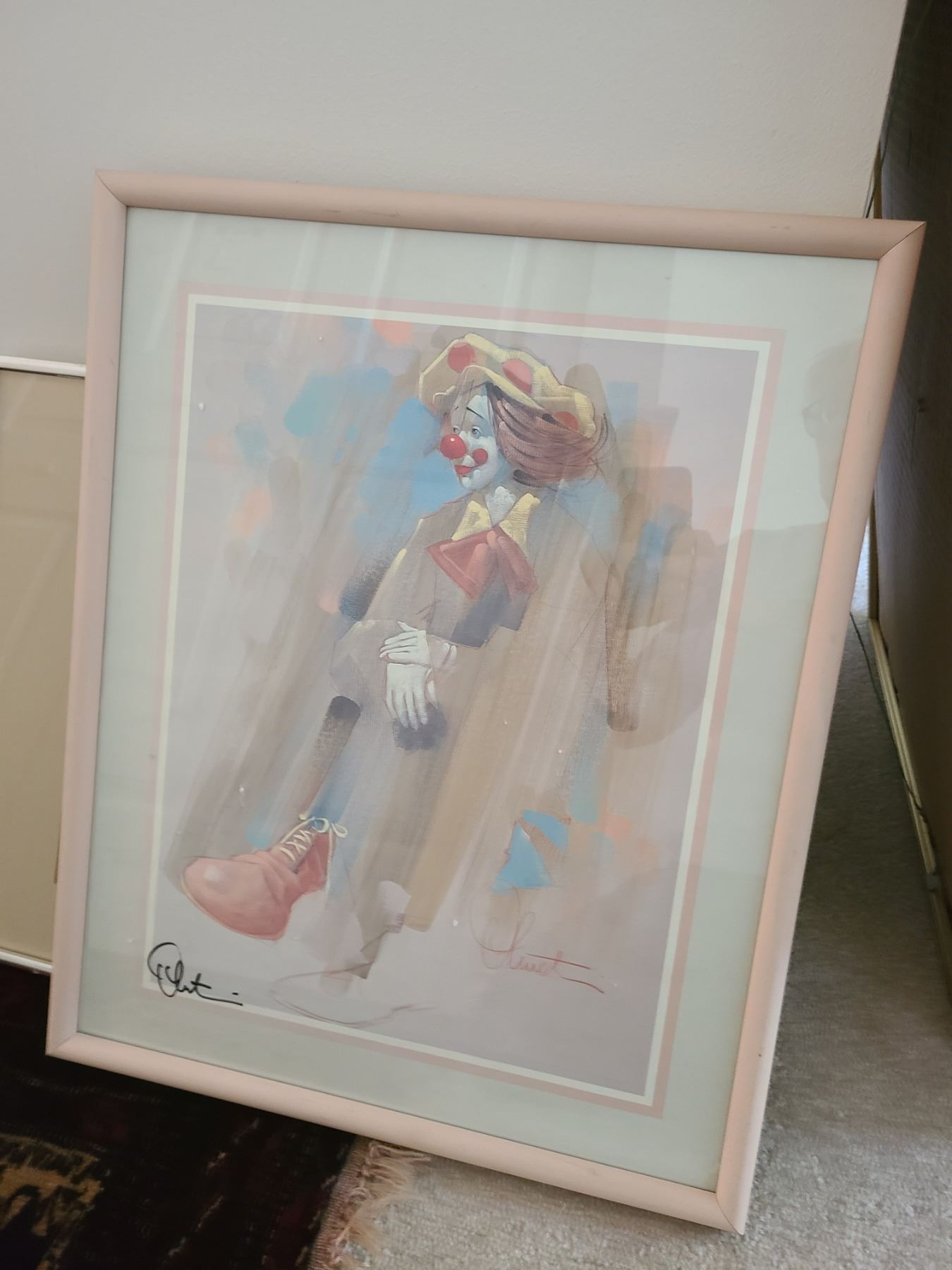 Two signed pictures of a forest and a clown and two unknown. Pickup at 9 am.