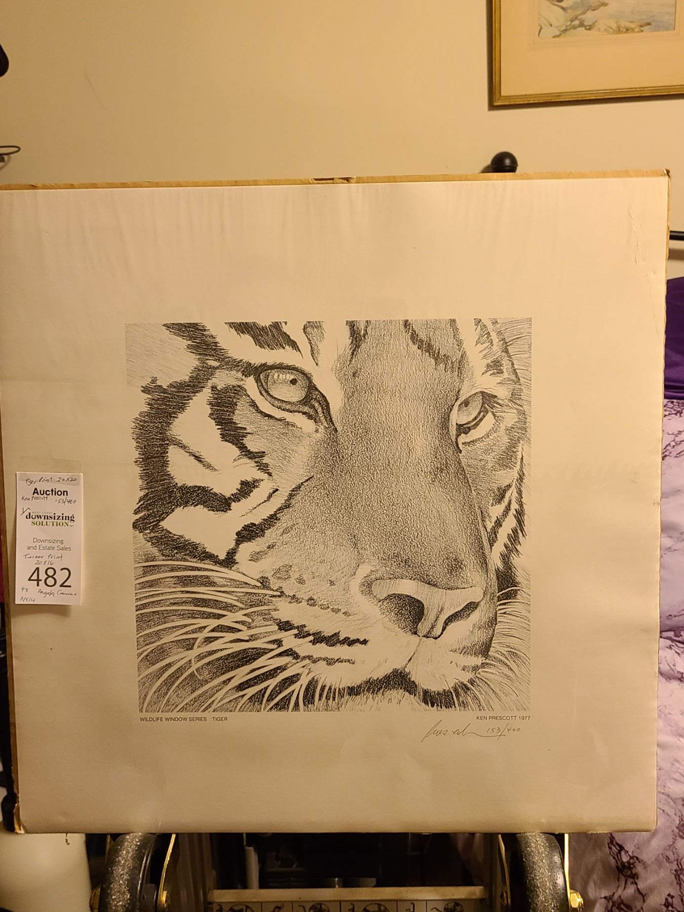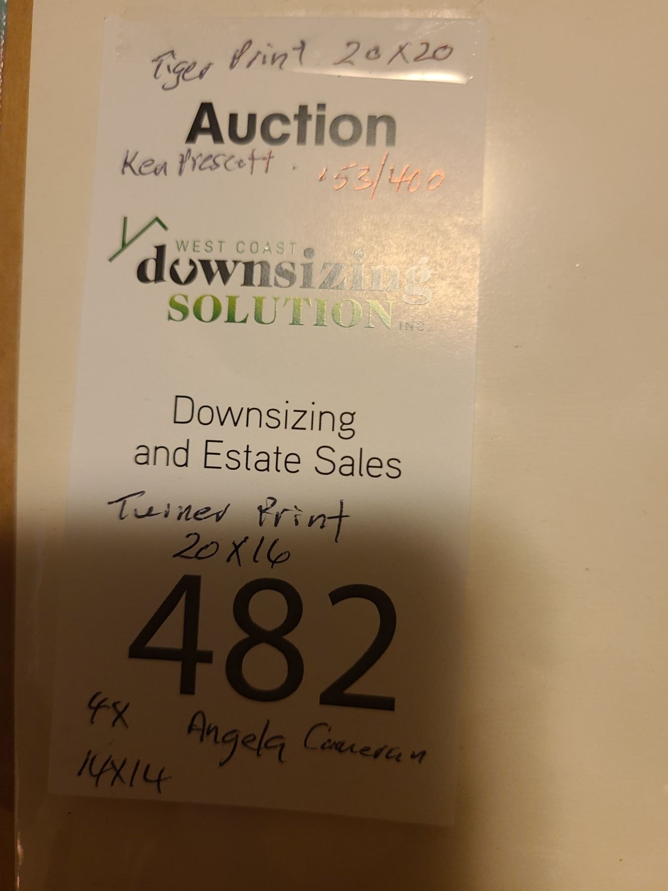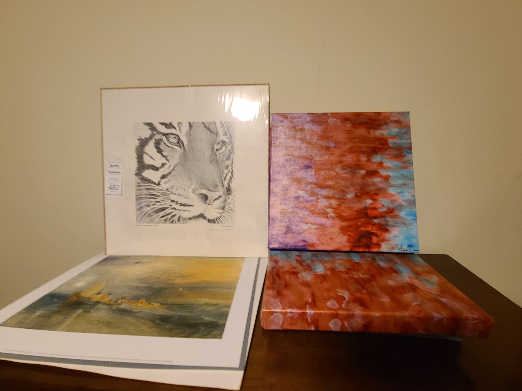 Four art pieces by Angela Cameron 14x14, tiger print by Ken Prescott and Turner print. Pickup cat. A at 9 am.
