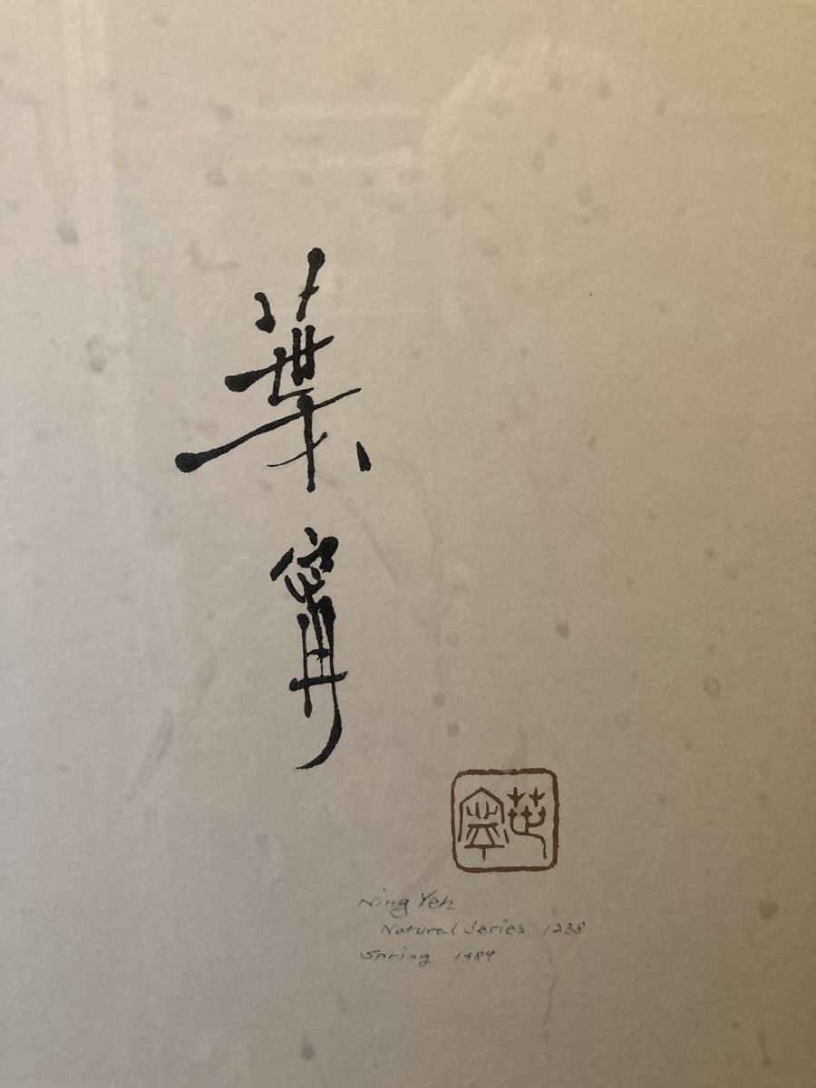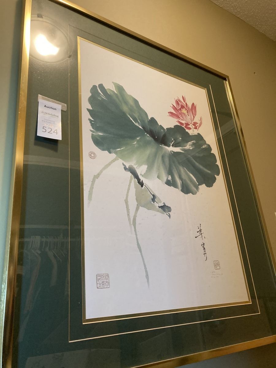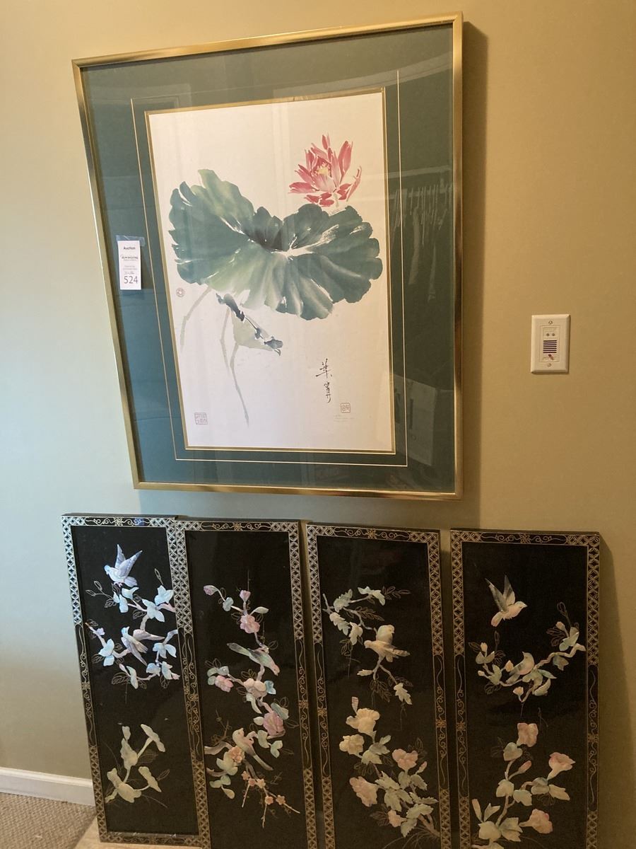 Signed watercolour by Ning Yeh 30x36, and 4 Asian style pieces. Please note warping on Asian style art. Pickup 9-10am.