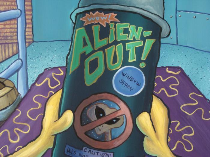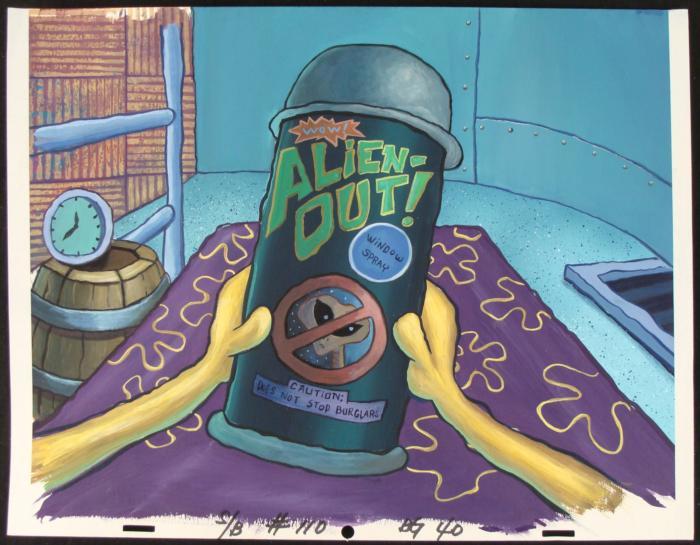 This original hand-painted background from the Nickelodeon TV show SpongeBob Squarepants. The story takes place under the deep blue sea in Bikini Bottom, where SpongeBob resides. SpongeBob, who is a yellow, porous sponge, is your typical happy-go-lucky character, as he is always cheerful and enjoys making people laugh. Patrick Star, SpongeBob's neighbor who is a starfish, is your average children's show idiot, as he boasts knowing nothing and is often getting himself into ridiculous situations. Between the homes of these two lies the home of the miserable Squidward, a squid, who is known for being grouchy and playing tricks on SpongeBob and Patrick. Both SpongeBob and Squidward work at the Krusty Krab, a fast food business run by the greedy money-loving Mr. Krabs, a crab, the arch rival of the evil, possibly misunderstood, Plankton. Another neighbor, Sandy Cheeks, an athletic squirrel who normally wears an astronaut's space suit, was introduced in "Tea at the Treedome." She spends most of her time inventing and experimenting. Spongebob is up to one of crazy stunts again, this time he's checking out his Alien Out can. Original Production Background Overall Size of Background: 10 1/4" x 13 1/4" Very good condition; it has been stored rolledOriginal Production Backgrounds are used in the making of the final version of animated productions. The background establishes the location and the overall good mood of the scenee. Typically, a background layout artist creates a drawing to establish the content of the scene, placement of characters, perspective and camera angle. Based on this drawing, the background artist creates a preliminary painting to confirm all of the scenes details, then the final production background which is used in the filming of the scene. When these backgrounds are individually photographed behind the progression of production cels, and projected at a rapid succession, the images in the foreground appear to move, creating an animated scene. The background is ready to be matted and framed. It is a colored background with the animator's notations at the bottom.