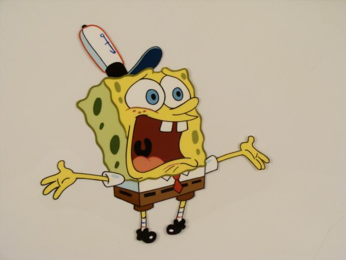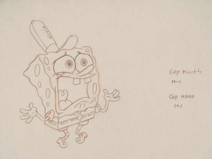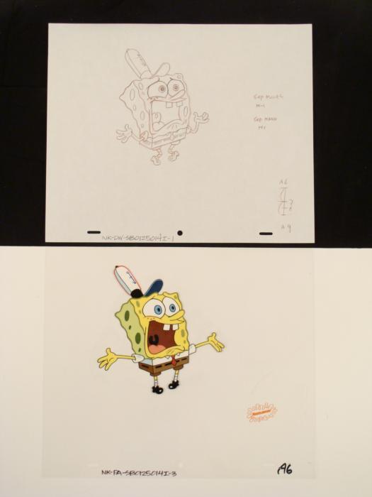 This original animation cel and drawing is from the Nickelodeon TV show SpongeBob Squarepants. The story takes place under the deep blue sea in Bikini Bottom, where SpongeBob resides. SpongeBob, who is a yellow, porous sponge, is your typical happy-go-lucky character, as he is always cheerful and enjoys making people laugh. Patrick Star, SpongeBob's neighbor who is a starfish, is your average children's show idiot, as he boasts knowing nothing and is often getting himself into ridiculous situations. Between the homes of these two lies the home of the miserable Squidward, a squid, who is known for being grouchy and playing tricks on SpongeBob and Patrick. Both SpongeBob and Squidward work at the Krusty Krab, a fast food business run by the greedy money-loving Mr. Krabs, a crab, the arch rival of the evil, possibly misunderstood, Plankton. Another neighbor, Sandy Cheeks, an athletic squirrel who normally wears an astronaut's space suit, was introduced in "Tea at the Treedome." She spends most of her time inventing and experimenting. . SpongeBob is panicking!Original Production Animated Cel and Drawing Original "rough" animation drawing, in black and red pencil, with notations in black. Overall Size of Drawing: 10 1/2" x 12 1/2" Overall Size of Cel: 10 1/2" x 12 1/2" Excellent ConditionThis is an original hand-painted cel set-up used in the production of an episode of "SpongeBob SquarePants." Each one-of-a-kind set-up represents a slight change in position of the characters. When individually photographed and projected in rapid succession, the images appear to move.