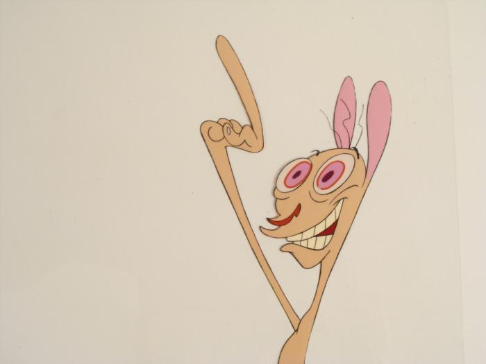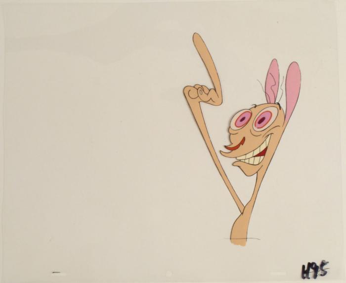 This is an original production animation cel from the Nickelodeon TV show Ren & Stimpy. The show follows two characters - Ren, a crazy Chihuahua - and - Stimpy, an incredibly stupid cat - as they think up to all kinds of hair brained schemes and get themselves into some sticky situations. The Ren and Stimpy Show debuted in August 1991 with a two-part episode, 'Stimpy's Big Day / The Big Shot' and became an instant hit. It was the third Nicktoon ever to be aired on the Network alongside Doug and Rugrats. Why is Ren holding up one finger?Original Production Art Cel Overall Size of the Cel: 10 1/2" x 1/2" Very Good condition This is an original hand-painted cel set-up used in the production of an episode of "The Ren & Stimpy Show." Each one-of-a-kind set-up represents a slight change in position of the characters. When individually photographed and projected in rapid succession, the images appear to move.