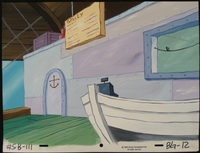 This original hand-painted background from the Nickelodeon TV show SpongeBob Squarepants. The story takes place under the deep blue sea in Bikini Bottom, where SpongeBob resides. SpongeBob, who is a yellow, porous sponge, is your typical happy-go-lucky character, as he is always cheerful and enjoys making people laugh. Patrick Star, SpongeBob's neighbor who is a starfish, is your average children's show idiot, as he boasts knowing nothing and is often getting himself into ridiculous situations. Between the homes of these two lies the home of the miserable Squidward, a squid, who is known for being grouchy and playing tricks on SpongeBob and Patrick. Both SpongeBob and Squidward work at the Krusty Krab, a fast food business run by the greedy money-loving Mr. Krabs, a crab, the arch rival of the evil, possibly misunderstood, Plankton. Another neighbor, Sandy Cheeks, an athletic squirrel who normally wears an astronaut's space suit, was introduced in "Tea at the Treedome." She spends most of her time inventing and experimenting. May I take your order?Original Production Background Overall Size of Background: 10 1/2" x 13 3/4" Very good condition; it has been stored Original Production Backgrounds are used in the making of the final version of animated productions. The background establishes the location and the overall good mood of the scenee. Typically, a background layout artist creates a drawing to establish the content of the scene, placement of characters, perspective and camera angle. Based on this drawing, the background artist creates a preliminary painting to confirm all of the scenes details, then the final production background which is used in the filming of the scene. When these backgrounds are individually photographed behind the progression of production cels, and projected at a rapid succession, the images in the foreground appear to move, creating an animated scene. The background is ready to be matted and framed. It is a colored background with the animator's notations at the bottom.