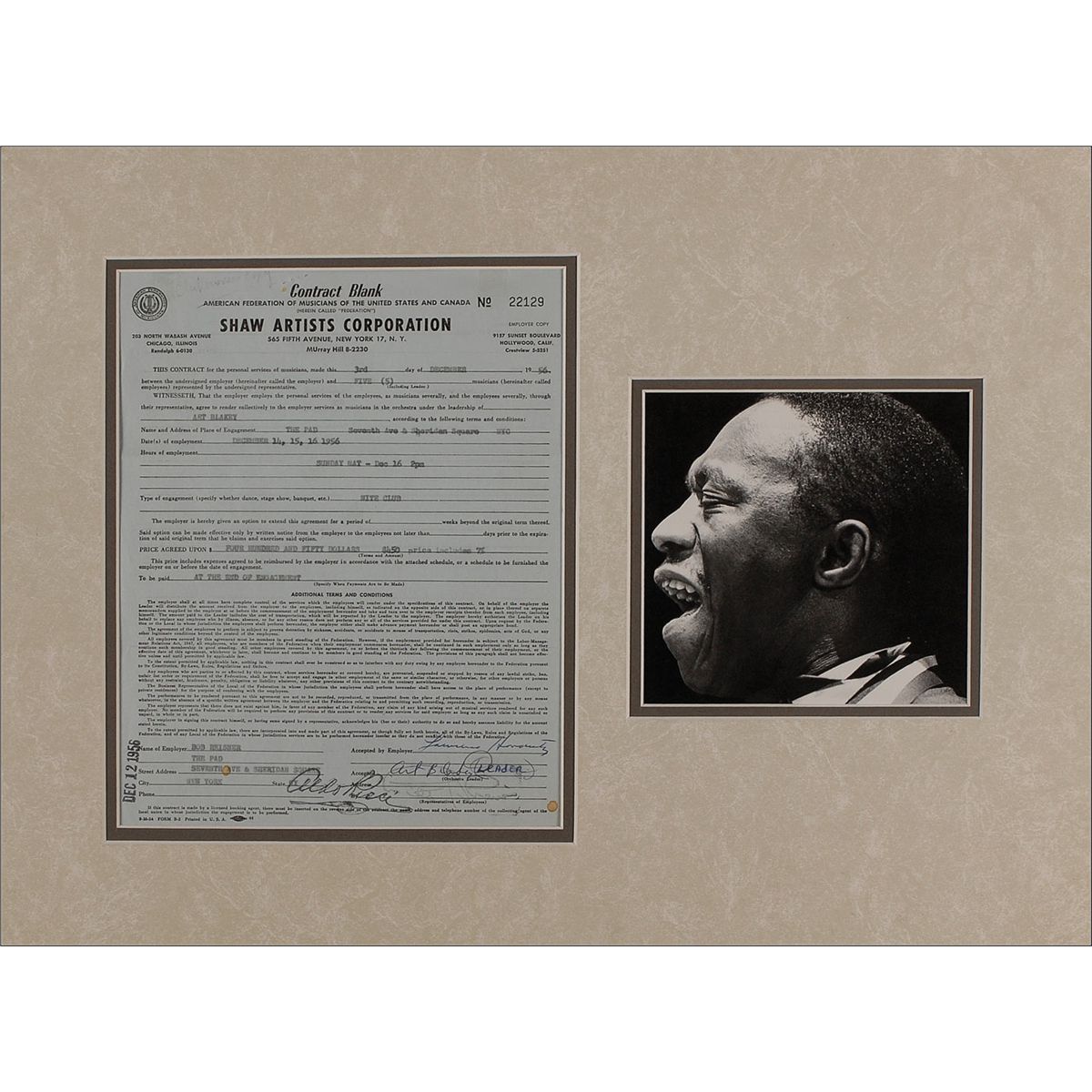 DS, one page, 8.25 x 10.75, December 3, 1956. Shaw Artists Corporation contract for “the personal service of musicians…in the orchestra under the leadership of Art Blakey,” to play “The Pad…Nite Club” for the agreed upon pay of $450.00, “to be paid at the end of engagement,” signed in blue ballpoint at the conclusion, “Art Blakey,” with “(Leader)” added in another hand, along with other signatures. Double-matted with a close-up image of the orchestral leader to an overall size of 20.75 x 15.75. In very good condition, with three horizontal folds, a few trivial spots of soiling, a staple mark and pencil notation at the top border, and a stamp dated December 12, 1956, on the left edge.