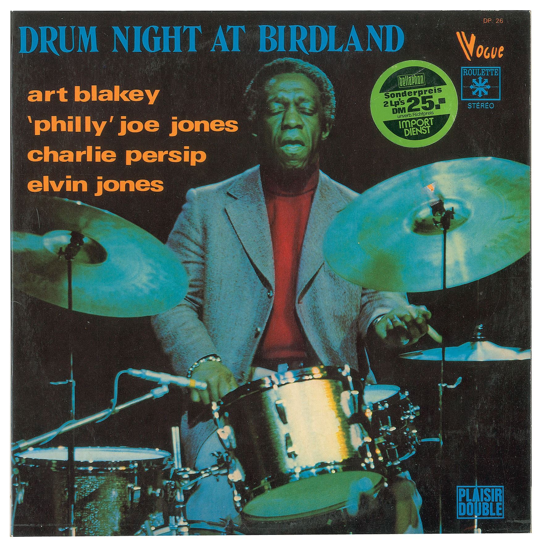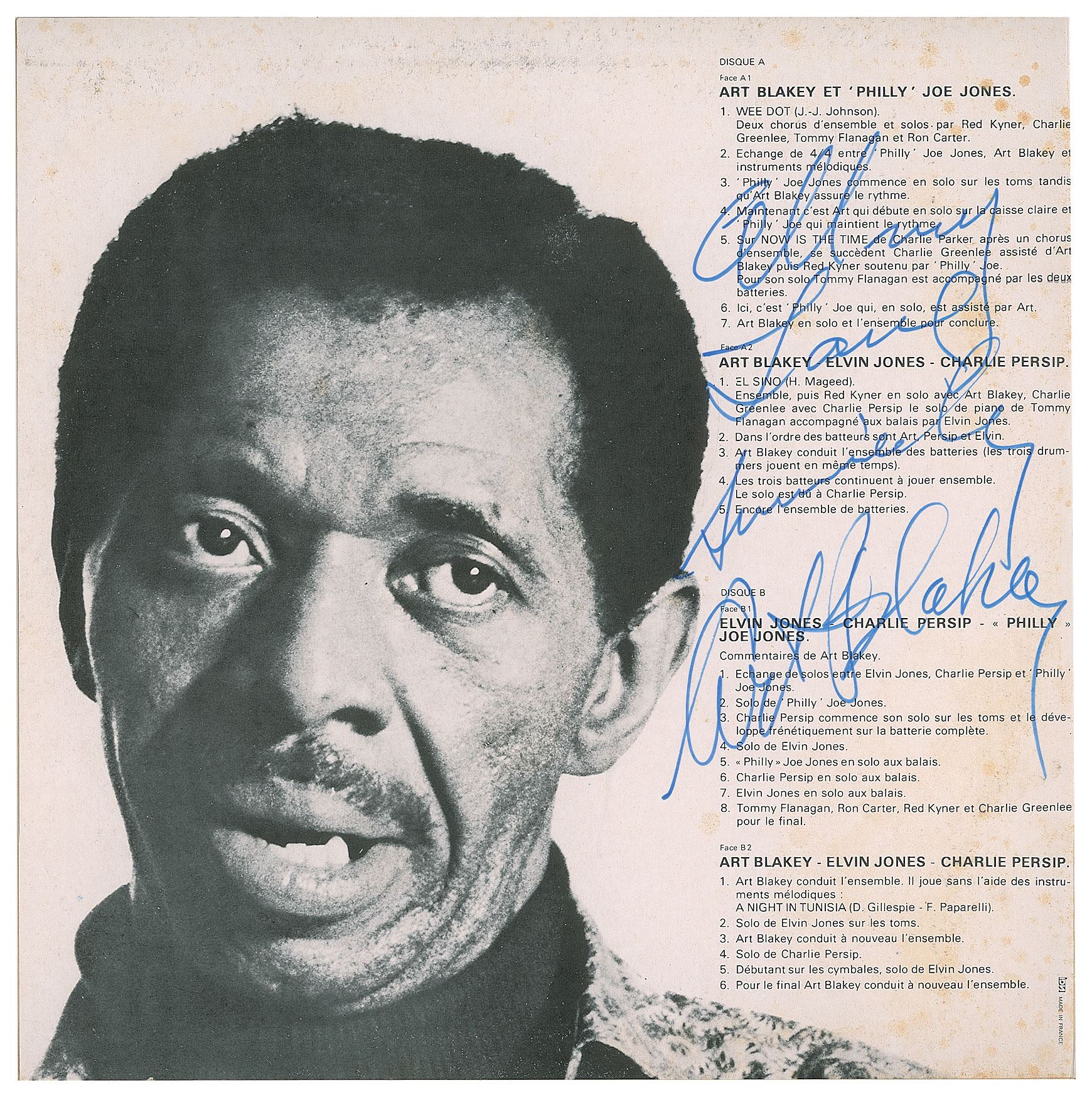Drum Night at Birdland album signed on the gatefold in blue felt tip, "All my Love, Sincerely, Art Blakey." In fine condition, with splattered light stains to the signed panel. The records are included.