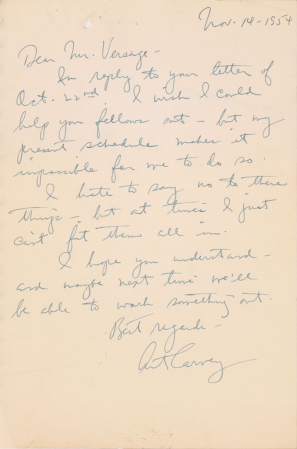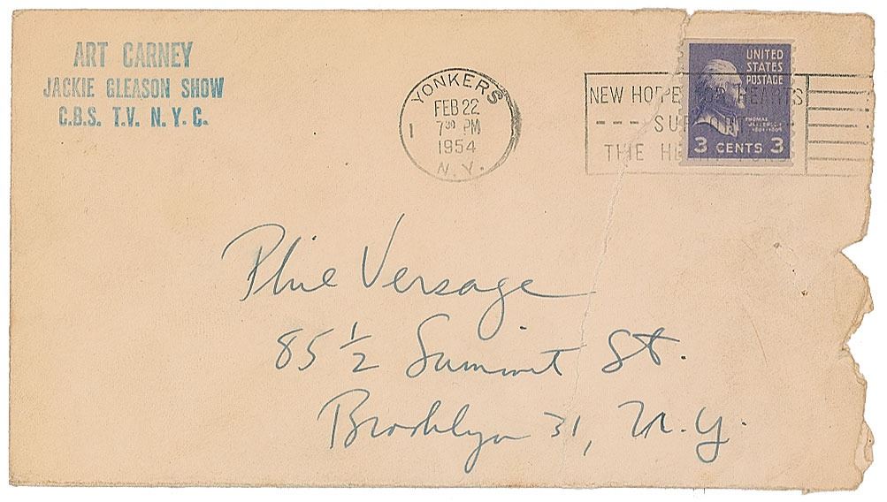 ALS, one page, 6.75 x 10, November 14, 1954. Letter to Phil Versage, in full: "In reply to your letter of Oct. 22nd, I wish I could help you fellows out—but my present schedule makes it impossible for me to do so. I hate to say no to these things—but at times I just can't fit them all in. I hope you understand and maybe next time we'll be able to work something out." In fine condition, with two torn staple holes at the top. Accompanied by the original mailing envelope, addressed in Carney's own hand and stamped: "Art Carney, Jackie Gleason Show, C.B.S. T.V. N.Y.C." It was during The Jackie Gleason Show, formerly known as Cavalcade of Stars, that Carney and Gleason developed their characters for The Honeymooners. The success of these early skits resulted in the CBS premiere of The Honeymooners on October 1, 1955, roughly a year after this letter was written.