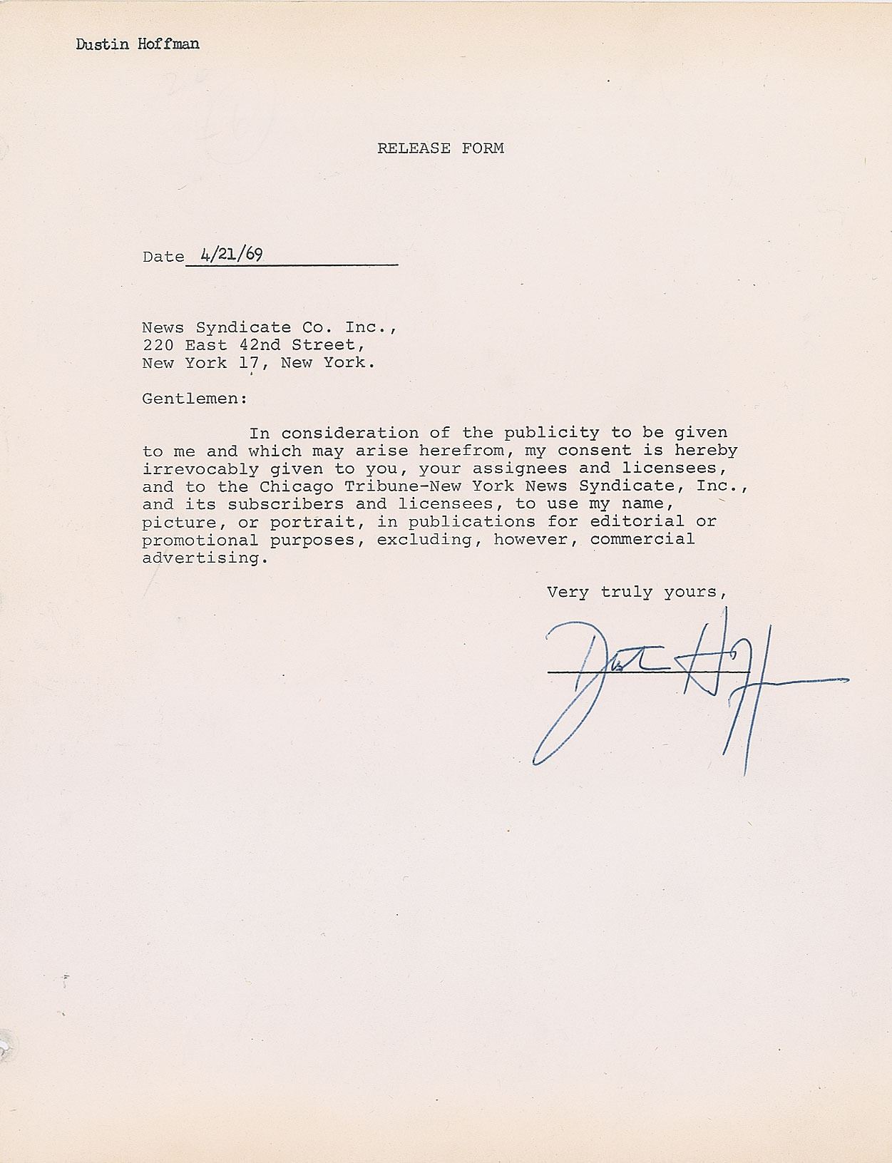 DS, one page, 8.5 x 11, April 21, 1969. A release form, in full: "In consideration of the publicity to be given to me and which may arise herefrom, my consent is hereby irrevocably given to you, your assignees and licensee, and to the Chicago Tribune–New York News Syndicate, Inc., and its subscribers and licensees, to use my name, picture, or portrait, in publications for editorial or promotional purposes, excluding, however, commercial advertising." Signed at the conclusion by Hoffman. In fine condition. In his fourth film role, Hoffman received a Best Actor Oscar nomination for his role as Enrico Salvatore 'Ratso' Rizzo in the 1969 film Midnight Cowboy.