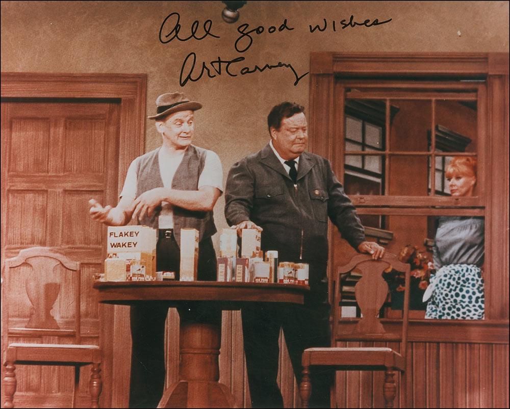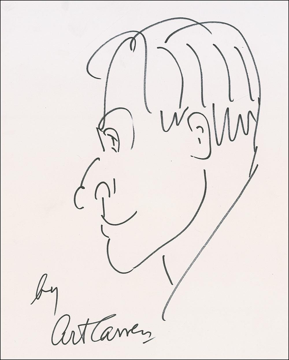 Two items: an original signed felt tip self-portrait profile on an off-white 8 x 10 sheet; and a color glossy 10 x 8 photo from The Honeymooners, signed in black felt tip. In very fine condition.
