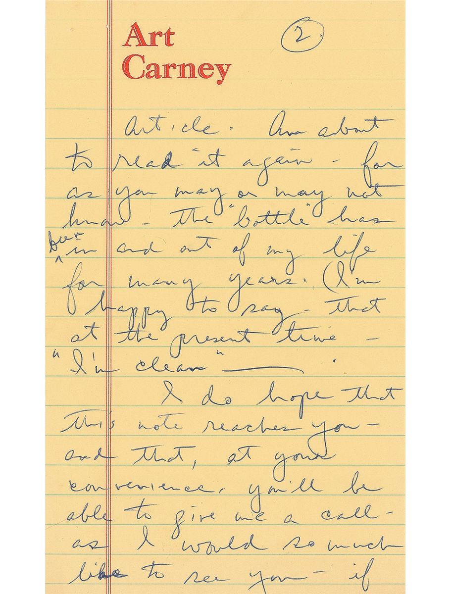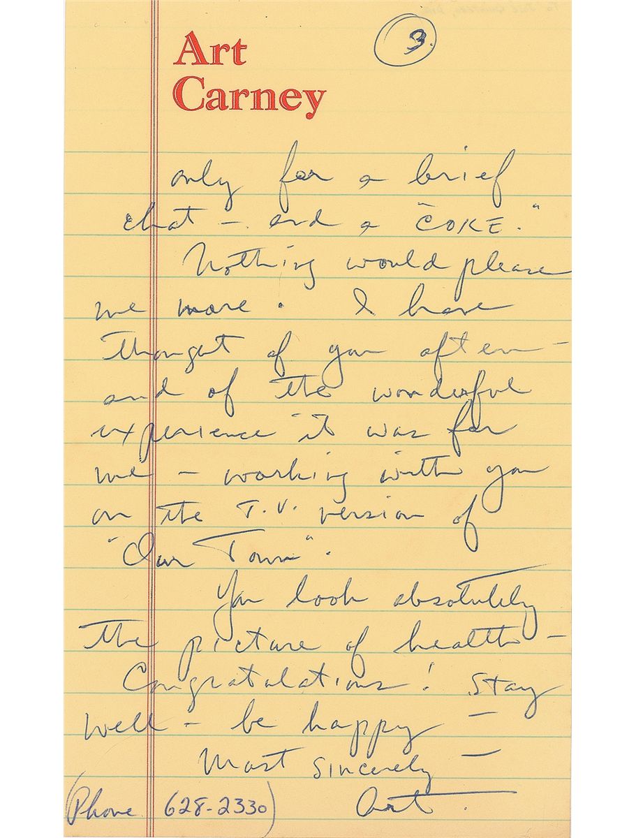 ALS signed “Art,” three pages, lightly-lined, 4.75 x 7.75, personal letterhead, January 19, 1974. Letter to director Jose Quintero. In part: “What an unforgettable evening in the theatre that was for me…Just finished reading the N. Y. Post article. Am about to read it again—for as you may or may not know‚ the ‘bottle’ has been in and out of my life for many years. I’m happy to say that at the present time—‘I’m clean’…I have thought of you often—and of the wonderful experience it was for me—working with you on the T. V. version of ‘Our Town.’” In fine condition.