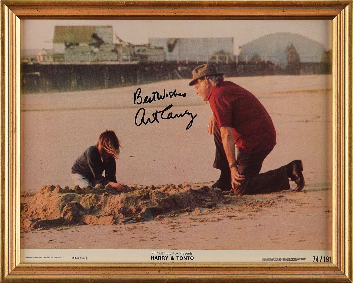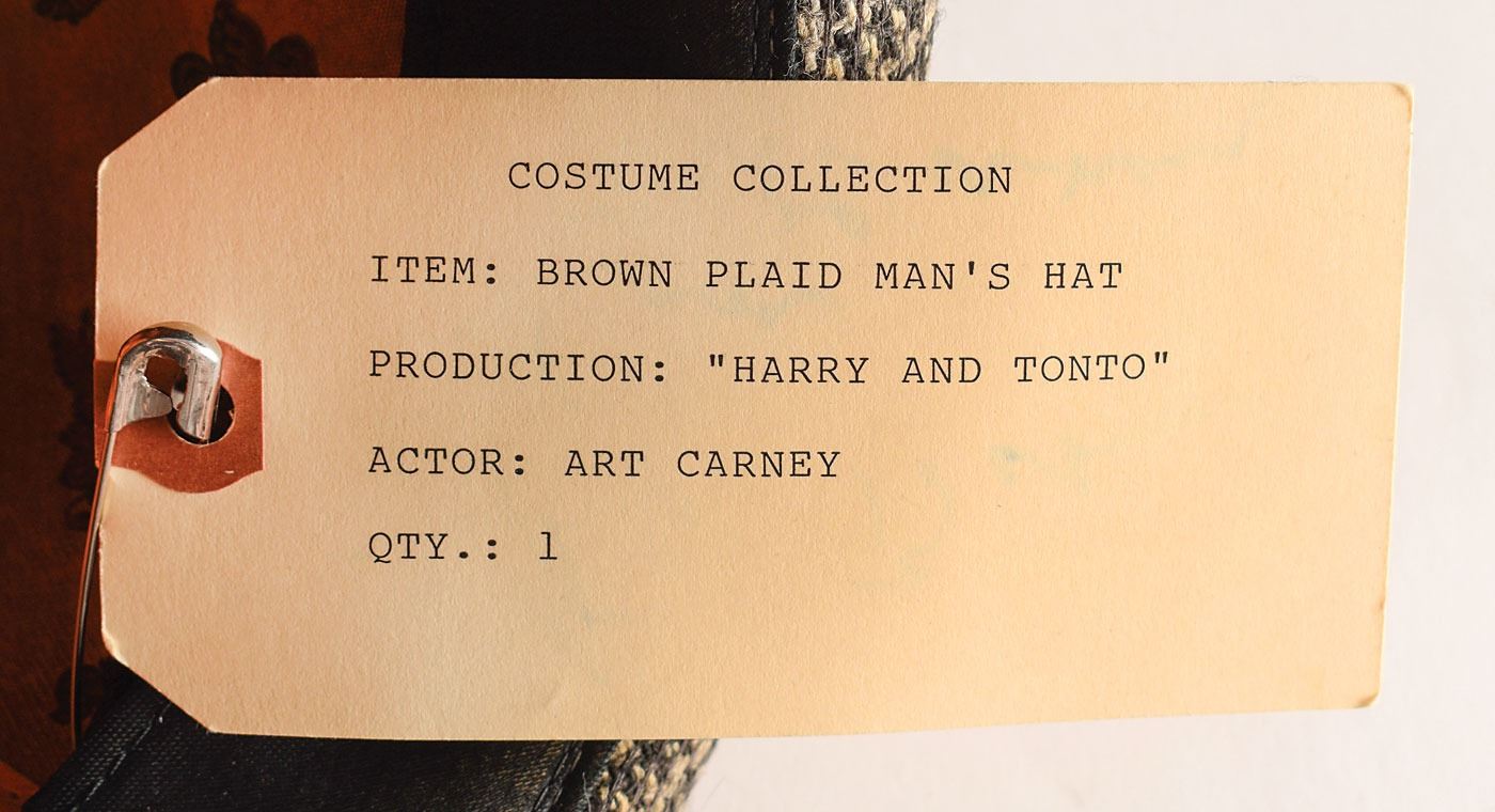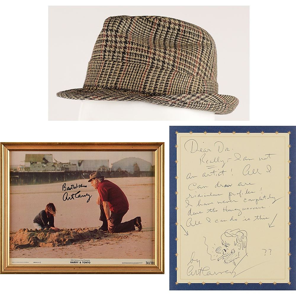 Art Carney's screen-worn hat from his Oscar-winning role as Harry Coombes in the 1974 film Harry and Tonto, with a tag safety-pinned inside, signed and inscribed in black felt tip, "To Bob, Love, Art Carney." The reverse of the tag bears a typed description: "Costume Collection, Item: Brown Plaid Men's Hat, Production: 'Harry and Tonto,' Actor: Art Carney." Includes an original color lobby card for the film that shows Carney wearing the hat, signed in black felt tip, "Best Wishes, Art Carney," framed to an overall size of 15 x 12. Also includes an ALS by Carney, one page, 8.5 x 11, in part: "Dear Dr., Really—I am not an artist! All I can draw are ridiculous profiles! I have never completely done the Honeymooners. All I can do is this:," sketching a humorous self-portrait below. In fine condition. All of these items were gifted by Carney to a doctor ("Bob") who was a neighbor in Connecticut. Carney won the 1974 Academy Award for Best Actor for playing Harry Combes, beating out iconic performances by Jack Nicholson (Chinatown) and Al Pacino (The Godfather Part II) for the prize.
