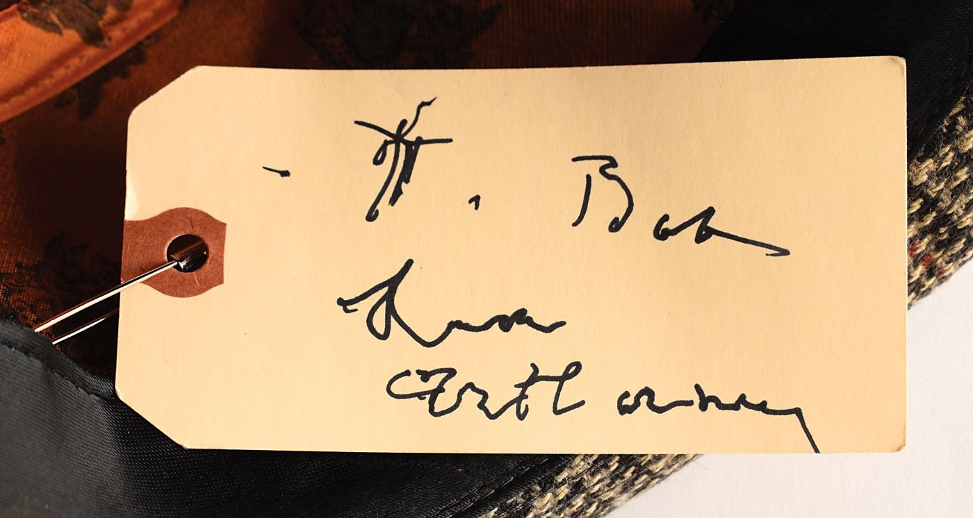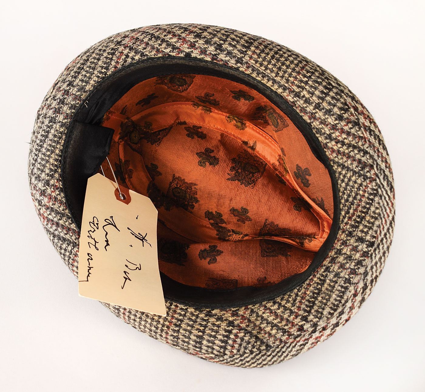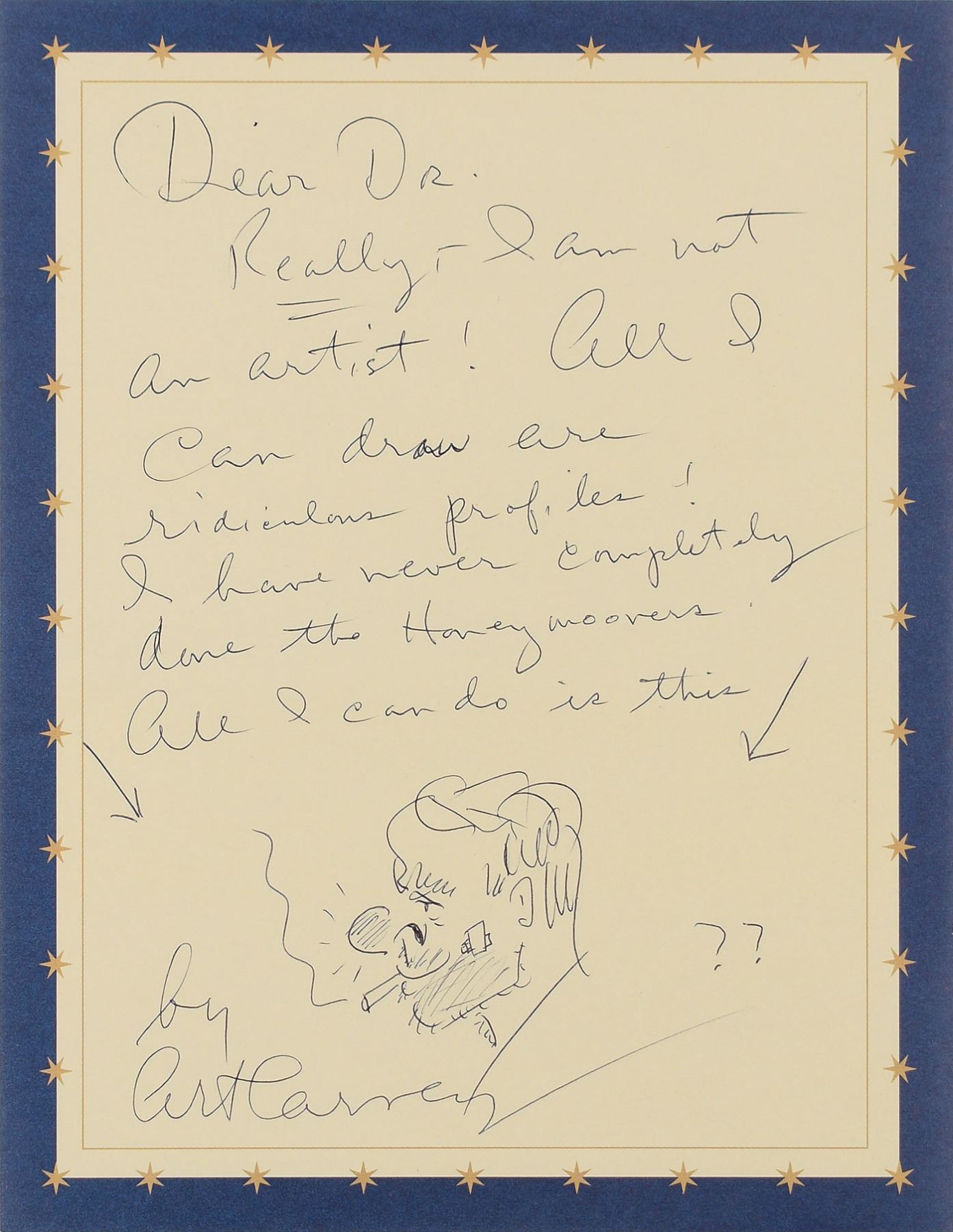 Art Carney's screen-worn hat from his Oscar-winning role as Harry Coombes in the 1974 film Harry and Tonto, with a tag safety-pinned inside, signed and inscribed in black felt tip, "To Bob, Love, Art Carney." The reverse of the tag bears a typed description: "Costume Collection, Item: Brown Plaid Men's Hat, Production: 'Harry and Tonto,' Actor: Art Carney." Includes an original color lobby card for the film that shows Carney wearing the hat, signed in black felt tip, "Best Wishes, Art Carney," framed to an overall size of 15 x 12. Also includes an ALS by Carney, one page, 8.5 x 11, in part: "Dear Dr., Really—I am not an artist! All I can draw are ridiculous profiles! I have never completely done the Honeymooners. All I can do is this:," sketching a humorous self-portrait below. In fine condition. All of these items were gifted by Carney to a doctor ("Bob") who was a neighbor in Connecticut. Carney won the 1974 Academy Award for Best Actor for playing Harry Combes, beating out iconic performances by Jack Nicholson (Chinatown) and Al Pacino (The Godfather Part II) for the prize.