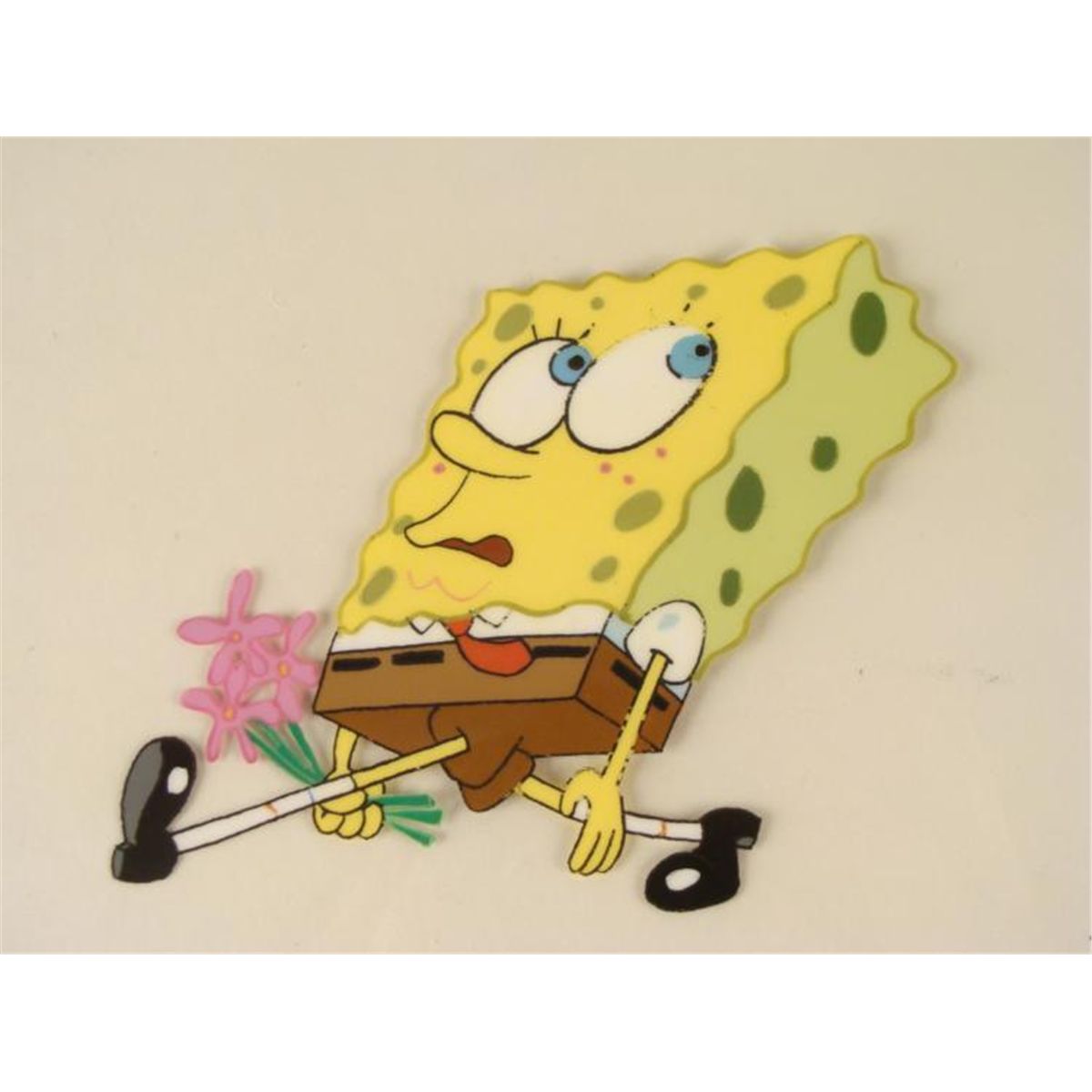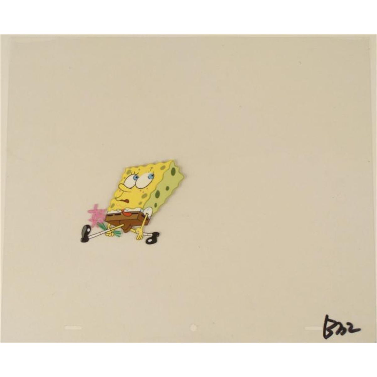This original animation cel is from the Nickelodeon TV show SpongeBob Squarepants. The story takes place under the deep blue sea in Bikini Bottom, where SpongeBob resides. SpongeBob, who is a yellow, porous sponge, is your typical happy-go-lucky character, as he is always cheerful and enjoys making people laugh. Patrick Star, SpongeBob's neighbor who is a starfish, is your average children's show idiot, as he boasts knowing nothing and is often getting himself into ridiculous situations. Between the homes of these two lies the home of the miserable Squidward, a squid, who is known for being grouchy and playing tricks on SpongeBob and Patrick. Both SpongeBob and Squidward work at the Krusty Krab, a fast food business run by the greedy money-loving Mr. Krabs, a crab, the arch rival of the evil, possibly misunderstood, Plankton. Another neighbor, Sandy Cheeks, an athletic squirrel who normally wears an astronaut's space suit, was introduced in "Tea at the Treedome." She spends most of her time inventing and experimenting. * And that's my cue to exit... * Original Production Animated Cel Overall Size of Cel: 10 1/2" x 12 1/2" Very Good ConditionThis is an original hand-painted cel set-up used in the production of an episode of "SpongeBob SquarePants." Each one-of-a-kind set-up represents a slight change in position of the characters. When individually photographed and projected in rapid succession, the images appear to move. * To create production cels, the original animator's drawing is transferred onto an acetate cel (by hand-inking and/or photo copying). The cel is then hand-painted on the reverse side. * The cel received by the winning bidder may be ever so slightly different from the one in the auction photos. * The cel is ready to be matted and framed. The animator's notations are at the bottom of the cel. There is some slight paint fade to Spongebob's outline. * * *
