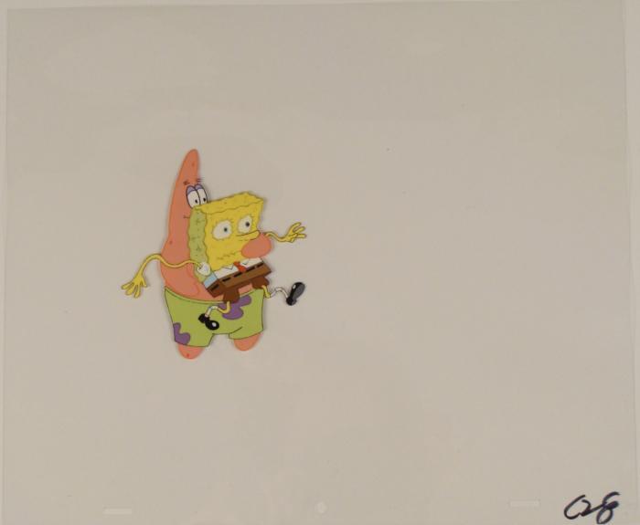 This original animation cel is from the Nickelodeon TV show SpongeBob Squarepants. The story takes place under the deep blue sea in Bikini Bottom, where SpongeBob resides. SpongeBob, who is a yellow, porous sponge, is your typical happy-go-lucky character, as he is always cheerful and enjoys making people laugh. Patrick Star, SpongeBob's neighbor who is a starfish, is your average children's show idiot, as he boasts knowing nothing and is often getting himself into ridiculous situations. Between the homes of these two lies the home of the miserable Squidward, a squid, who is known for being grouchy and playing tricks on SpongeBob and Patrick. Both SpongeBob and Squidward work at the Krusty Krab, a fast food business run by the greedy money-loving Mr. Krabs, a crab, the arch rival of the evil, possibly misunderstood, Plankton. Another neighbor, Sandy Cheeks, an athletic squirrel who normally wears an astronaut's space suit, was introduced in "Tea at the Treedome." She spends most of her time inventing and experimenting. Don't worry Spongebob, I have you...Original Production Animated Cel Overall Size of Cel: 10 1/2" x 12 1/2" Excellent ConditionThis is an original hand-painted cel set-up used in the production of an episode of "SpongeBob SquarePants." Each one-of-a-kind set-up represents a slight change in position of the characters. When individually photographed and projected in rapid succession, the images appear to move.