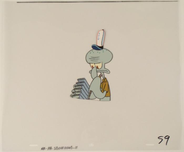 To create production cels, the original animator's drawing is transferred onto an acetate cel (by hand-inking and/or photo copying). The cel is then hand-painted on the reverse side. The cel is ready to be matted and framed. The animator's notations are at the bottom of the cel. There is some slight paint fade to Squidward's outline.