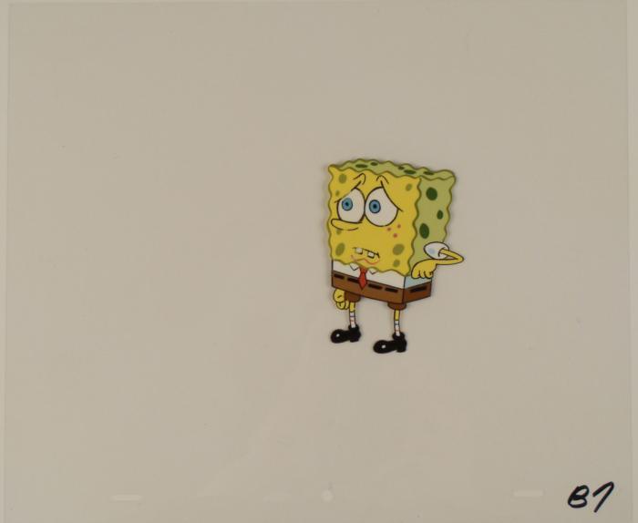 This original animation cel is from the Nickelodeon TV show SpongeBob Squarepants. The story takes place under the deep blue sea in Bikini Bottom, where SpongeBob resides. SpongeBob, who is a yellow, porous sponge, is your typical happy-go-lucky character, as he is always cheerful and enjoys making people laugh. Patrick Star, SpongeBob's neighbor who is a starfish, is your average children's show idiot, as he boasts knowing nothing and is often getting himself into ridiculous situations. Between the homes of these two lies the home of the miserable Squidward, a squid, who is known for being grouchy and playing tricks on SpongeBob and Patrick. Both SpongeBob and Squidward work at the Krusty Krab, a fast food business run by the greedy money-loving Mr. Krabs, a crab, the arch rival of the evil, possibly misunderstood, Plankton. Another neighbor, Sandy Cheeks, an athletic squirrel who normally wears an astronaut's space suit, was introduced in "Tea at the Treedome." She spends most of her time inventing and experimenting. What did Spongebob ever do to you?Original Production Animated Cel Overall Size of Cel: 10 1/2" x 12 1/2" Very good conditionThis is an original hand-painted cel set-up used in the production of an episode of "SpongeBob SquarePants." Each one-of-a-kind set-up represents a slight change in position of the characters. When individually photographed and projected in rapid succession, the images appear to move.