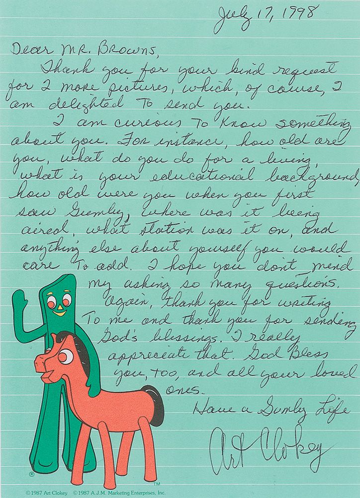 Stop-motion claymation pioneer (1921–2010) who created Gumby. ALS, one page, lightly-lined, 5.5 x 7.75, colorful illustrated Gumby letterhead, July 17, 1998. Letter to an admirer. In part: “I am curious to know something about you…how old were you when you first saw Gumby, where was it being aired, what station was it on…I hope you don’t mind my asking so many questions.” In fine condition.