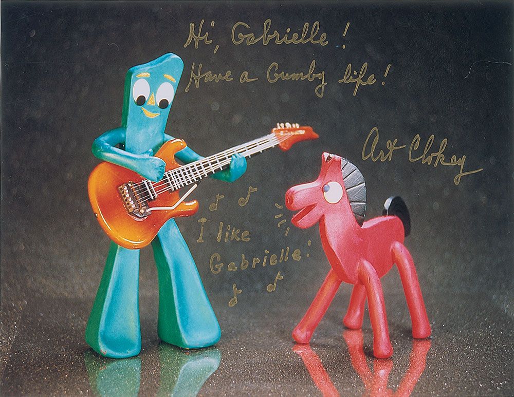 Stop-motion claymation pioneer (1921–2010) who created Gumby. Color glossy 7 x 5 photo of Gumby and Pokey singing, signed and inscribed in gold ink, “Hi, Gabrielle! Have a Gumby life! Art Clokey,” with Clokey adding “I like Gabrielle,” coming from Pokey’s mouth. In fine condition.