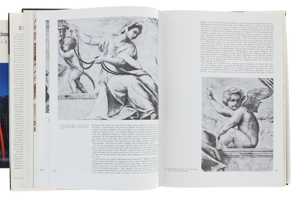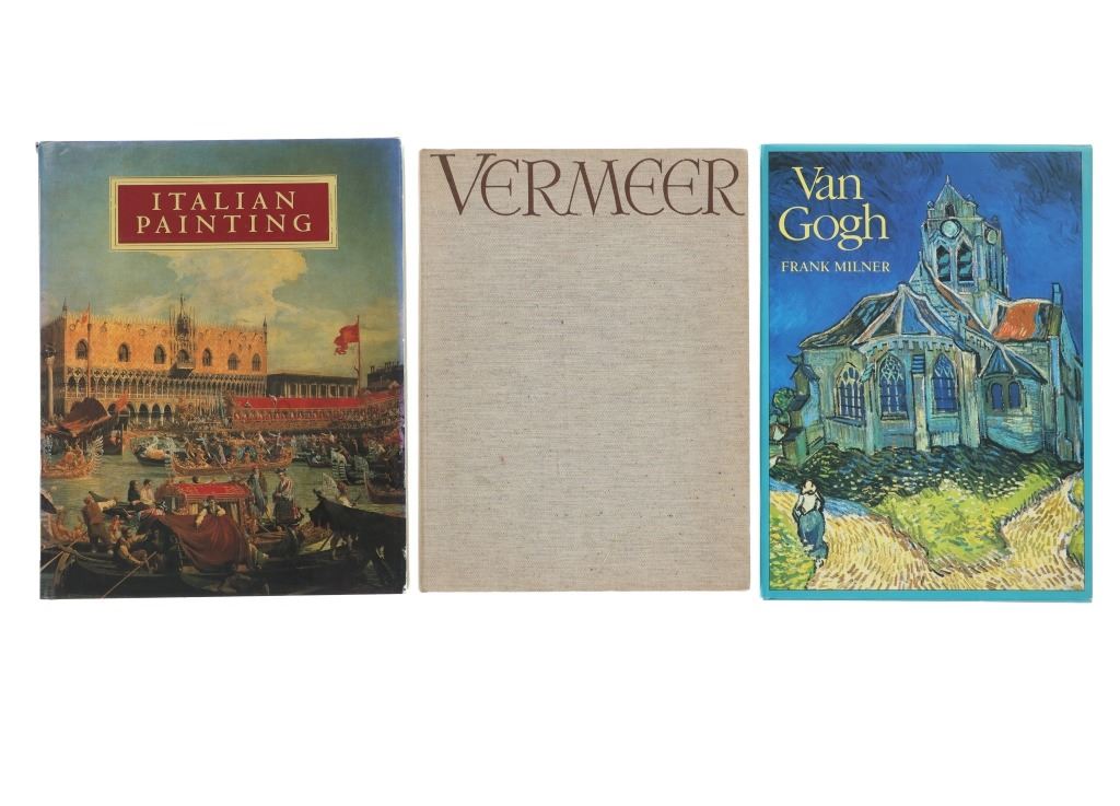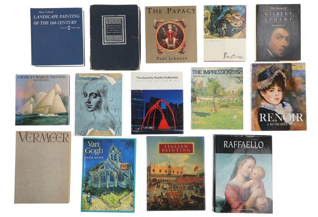 This lot includes fourteen (14) books on the Middle Ages, Renaissance, Enlightenment, and Modern Era Artists and Paintings. Artists featured include Michelangelo, Da Vinci, Renoir, Raffaello, Stuart, Van Gogh, as well as many many others, lavishly illustrated. Full of black and white as well as color illustrations, including over 60 individual reproductions from "One Hundred Reproductions Of The World's Great Paintings." A wonderful collection that chronicles some of the world's most majestic works of art. Books are in good overall condition, and many feature original paper dust jackets. Largest book measures 15"L x 11"W x 2"D with the smallest being 10"L x 10"W x .75"D.*