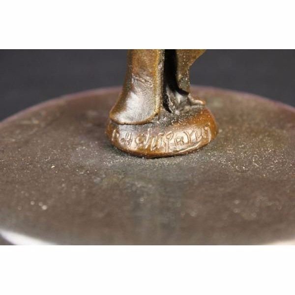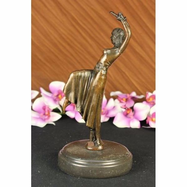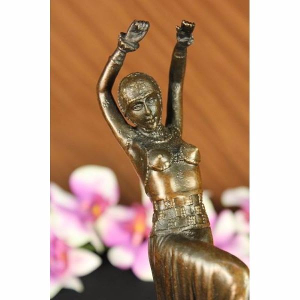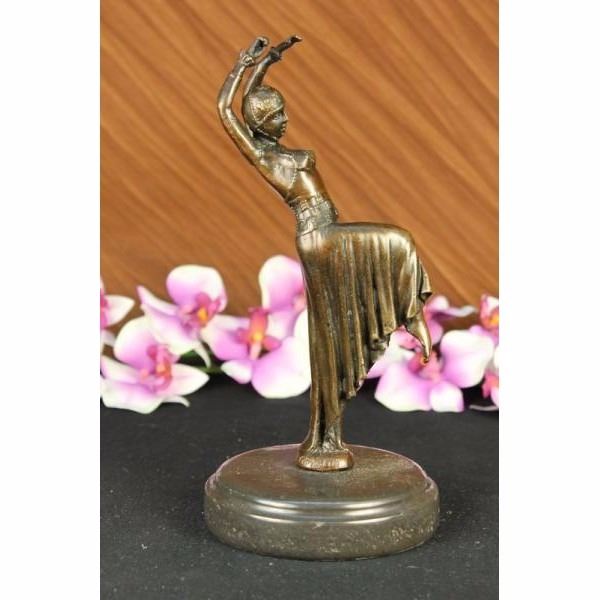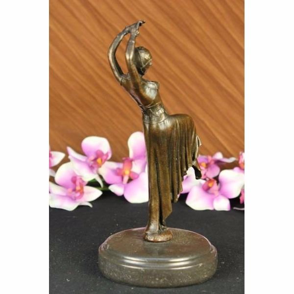 Marvelous flow in detail captured in Chiparus's form. Another stunning piece to collect decorate, and behold in your home or office. Only the highest quality in patina is used to last generations. The brown flesh tones are actually the amazing applications of a patina blend over bronze. This bronze dancer beautiful and an original Chiparus signature at the base of the bronze. Casted in Europe using the lost wax method. Notice the authenticity of this recast of the original sculpture by examining the head torso and hand positions. Poor reproductions do not use the original mold and create their sculptures based on artist's renditions. Notice the magnificent application of this patina blend which will was fused into the bronze to last for generations. She was captured using the age-old method of lost-wax casting and stained with a brown parina for preservation. The bronze sculpture is mounted upon a black marble base with the artist D.H Chiparus's signature. Condition: This sculpture is in PERFECT condition. Bronze Dimensions with Marble Base:Height 10" x Width 4 1/2" Marble Dimensions: Diameter 4 1/2". Height without base: 9" Weight : 5 LBS Inventory; 52Y2302025