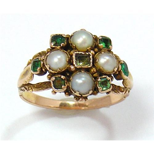Stunning Georgian gold ring. Four natural pearls form a cross with a central rectangular emerald. Six additional emeralds surround the pearls. All stones are prong set. The ensemble is eye catching in its design, culminating in a delicate ribbed shank which sets off the ring. It is unmarked, but tested to be not less than 14 Kt gold.